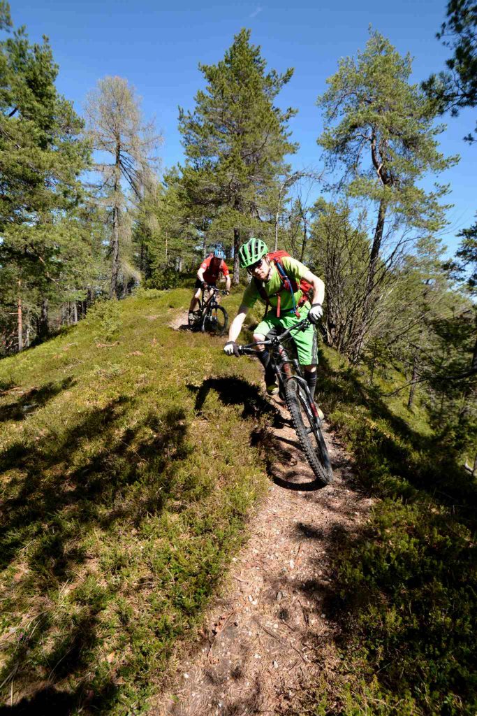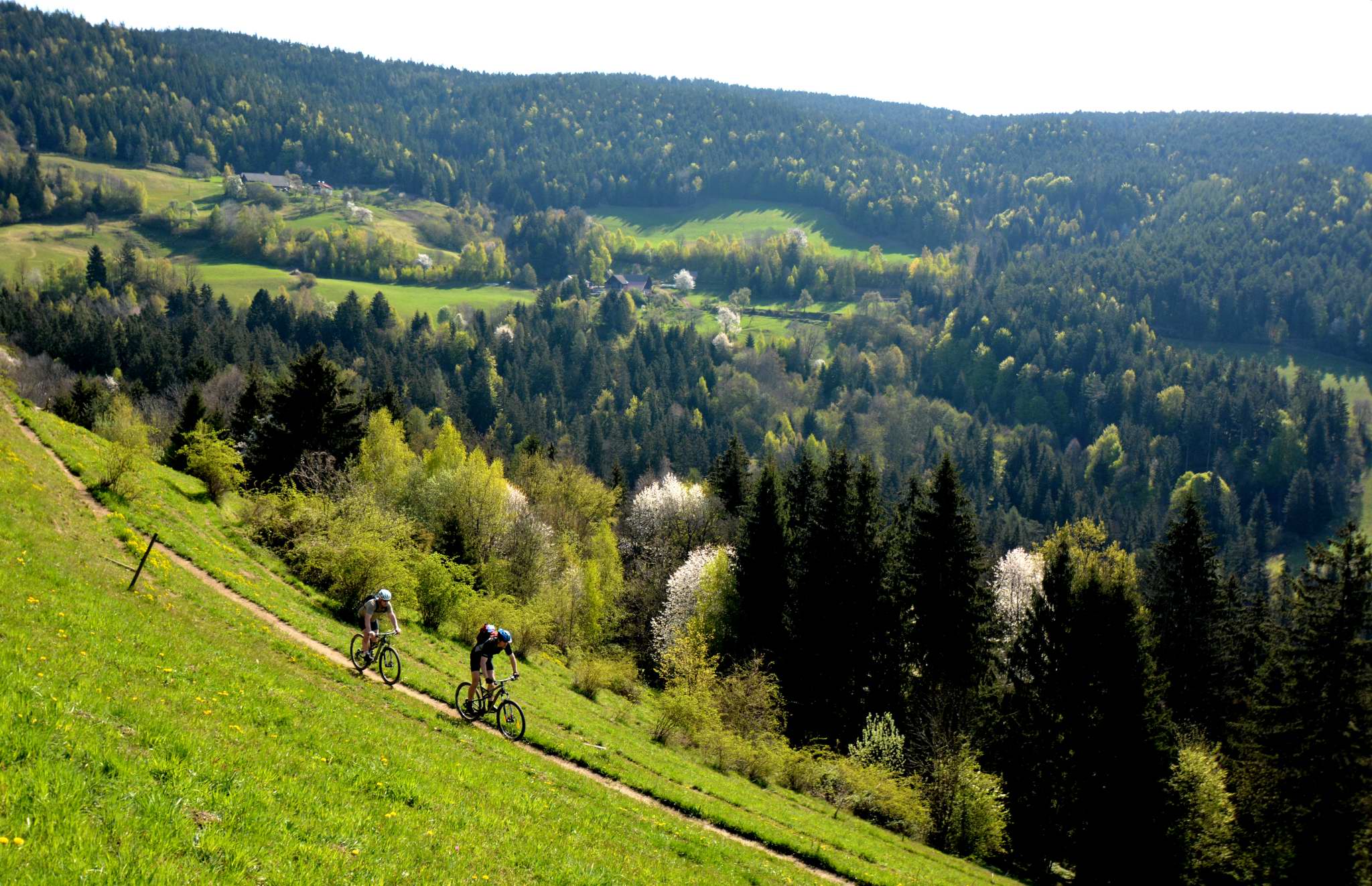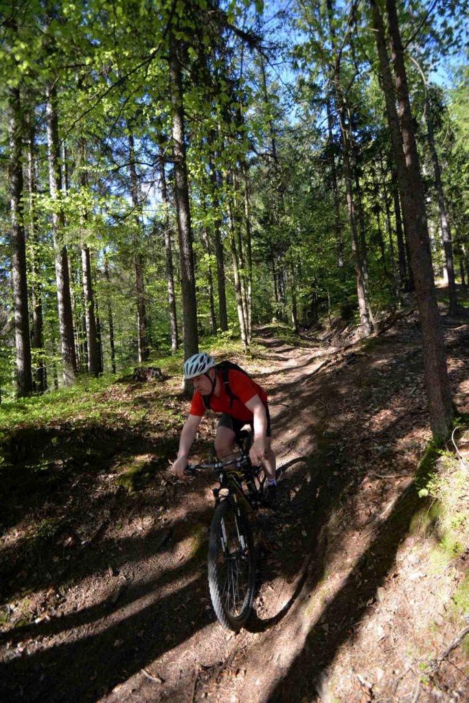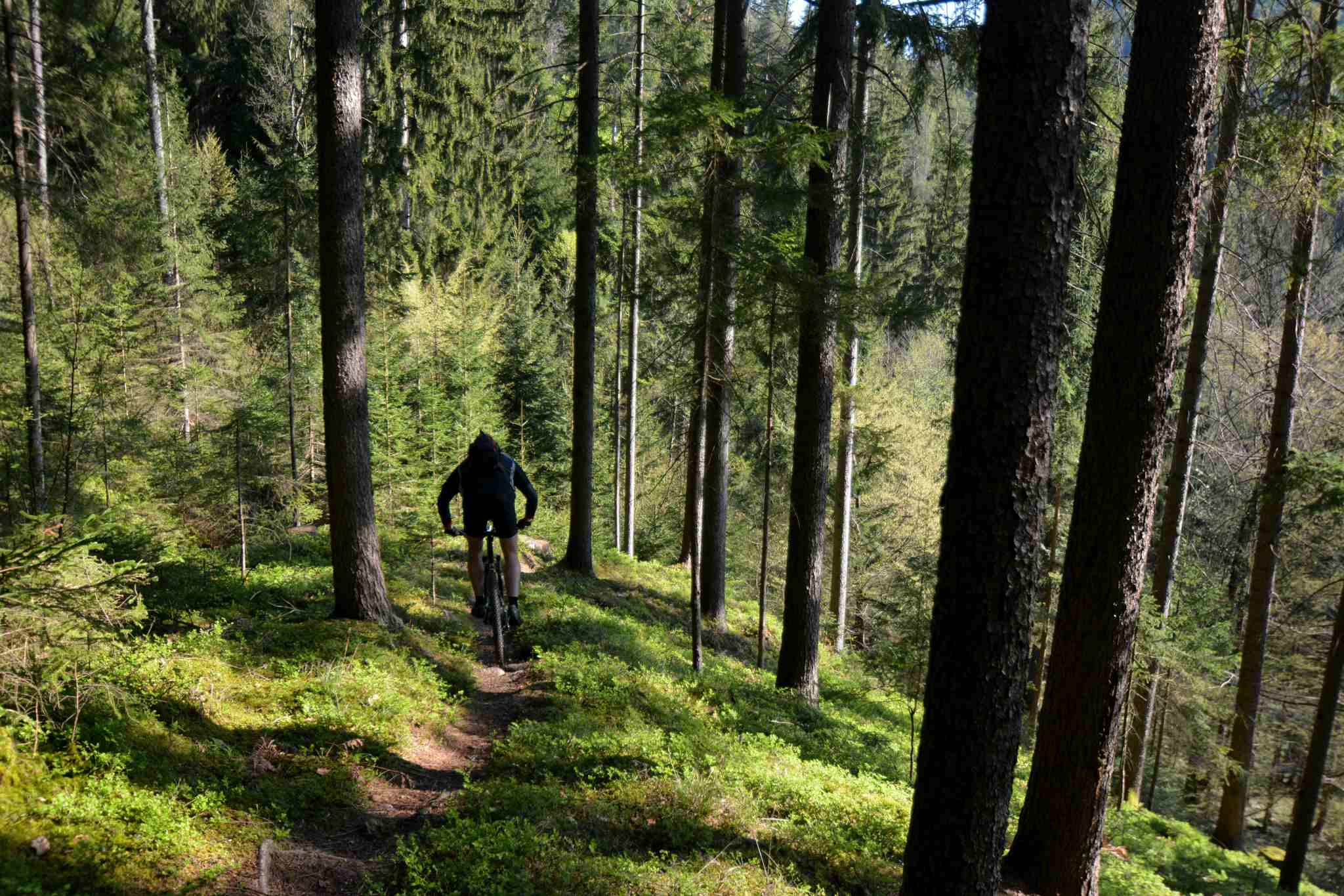 Le lendemain matin nous voilà donc gonflés à bloc, d’autant que le soleil se montre d’emblée généreux. Le but de cette première journée est de découvrir les nombreux singles et les parcours du bike parc entourant la ferme d’Anej. Nous prendrons d’abord de la hauteur en empruntant les « routes » locales, soit des pistes larges et roulantes nous permettant d’atteindre les sommets assez rapidement. L’effort est conséquent, mais la récompense est de taille : tout en haut, la vue est imprenable. A un peu plus de 1000 mètres d’altitude, la beauté de la nature et le silence profond régnant sur ses hauteurs donnerait presqu’envie de faire la sieste. Mais nous devrons repartir sans tarder.