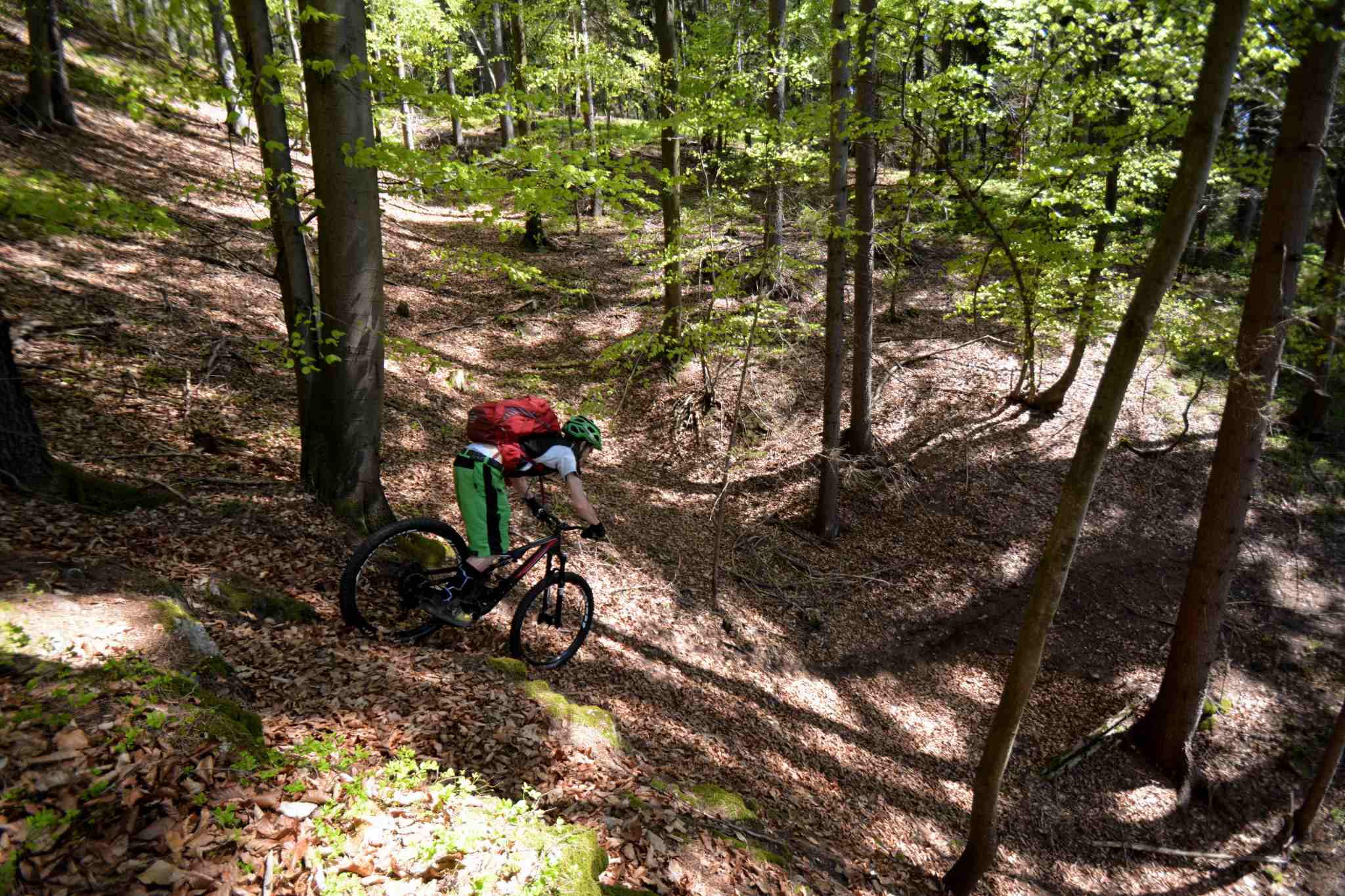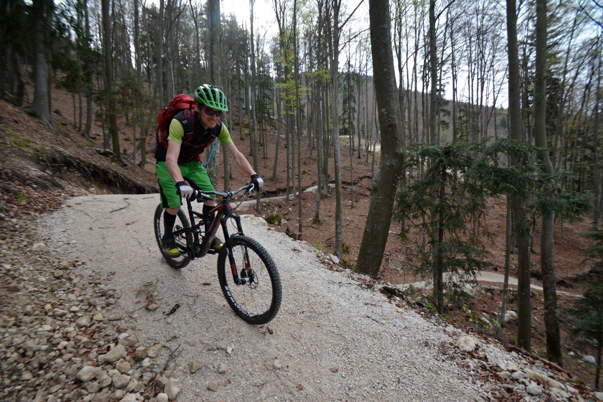 De l’autre côté du sommet, c’est une orgie de single qui nous attend ! On commence tout doucement par un sentier sinueux et très ludique, pour ensuite enchaîner avec une trace plus raide et plus cassante. En semi-rigide -même bien suspendu à l’avant- et surtout avec un frein récalcitrant, la chose se complique singulièrement… Nous avons bien du mal à accrocher la roue arrière d’Anej, tant notre guide est impressionnant de facilité. Il faut bien avouer que la trace est par endroit véritablement compliquée, les amateurs de sentiers épiques sont comblés.