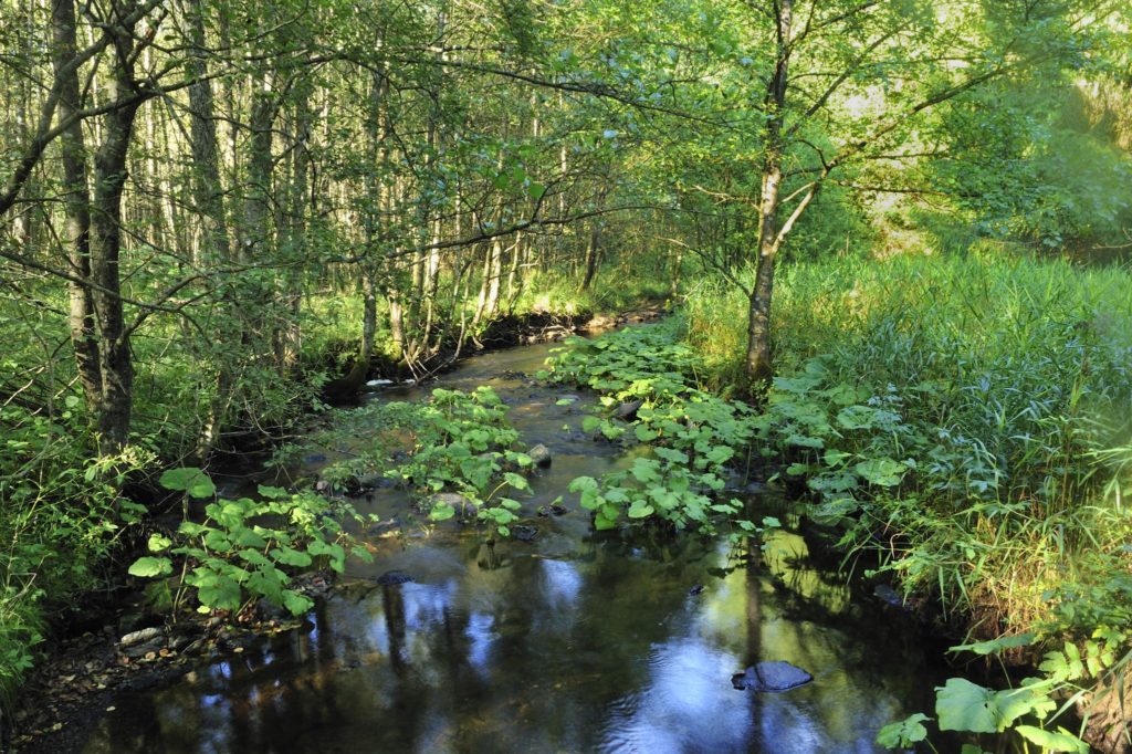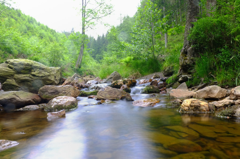 Nous dévalons le vallon pour aller à la rencontre d’une faune et d’une flore exceptionnelles. Quelle profusion de vie se rencontre le long du ruisseau. Et cette descente ne semble jamais finir… Sur la droite, nous découvrons un site de castor, alors qu’une cigogne noire vole avec grâce au-dessus de la canopée. Plus nous nous enfonçons dans la vallée, plus les bruits s’atténuent et se feutrent dans les broussailles.