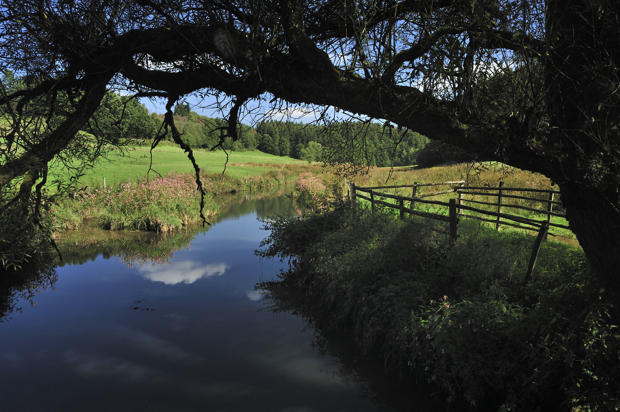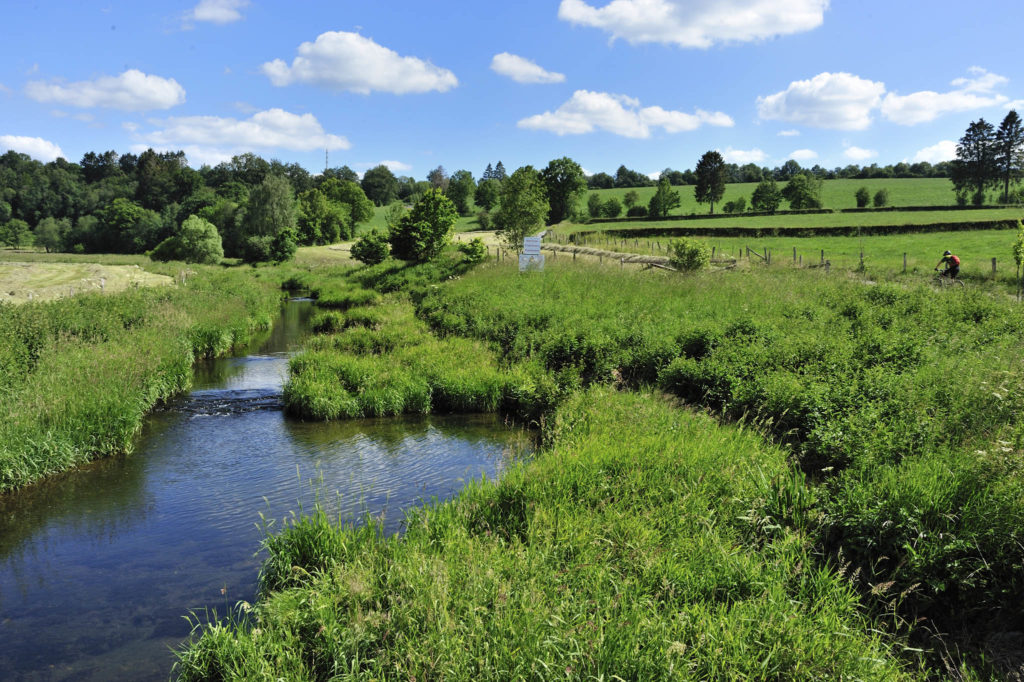 Les longues clôtures courent dans le paysage et rappellent les images d’Ecosse : le paysage près de la Vennbahn est magnifique et confirme la douceur de vivre qui s’en dégage. Une douce torpeur que nous retrouvons sur les rives de l’Amel. En contrebas, la Warche a tracé un cheminement naturel avec de jolis méandres se propageant sur la prairie.