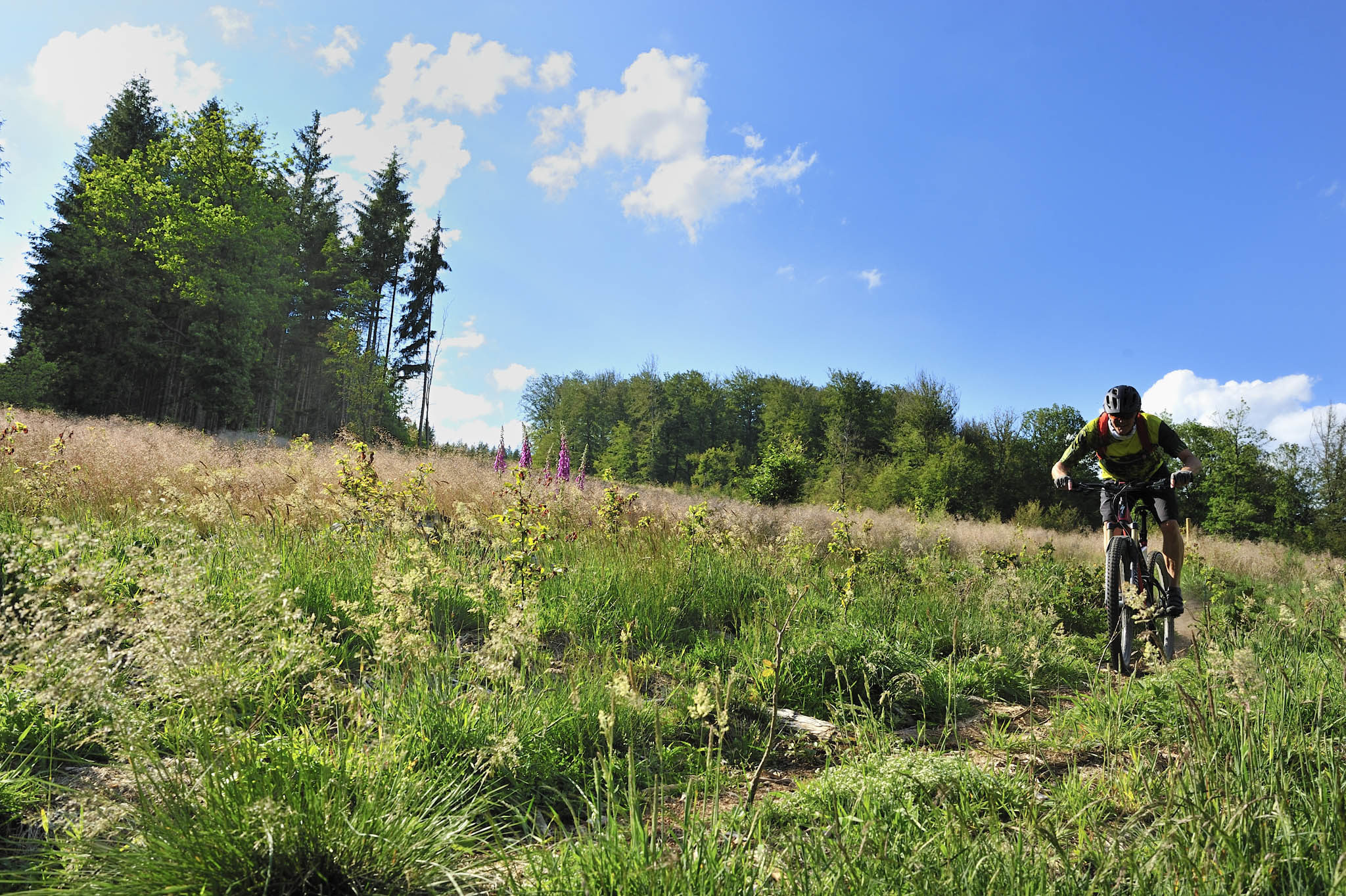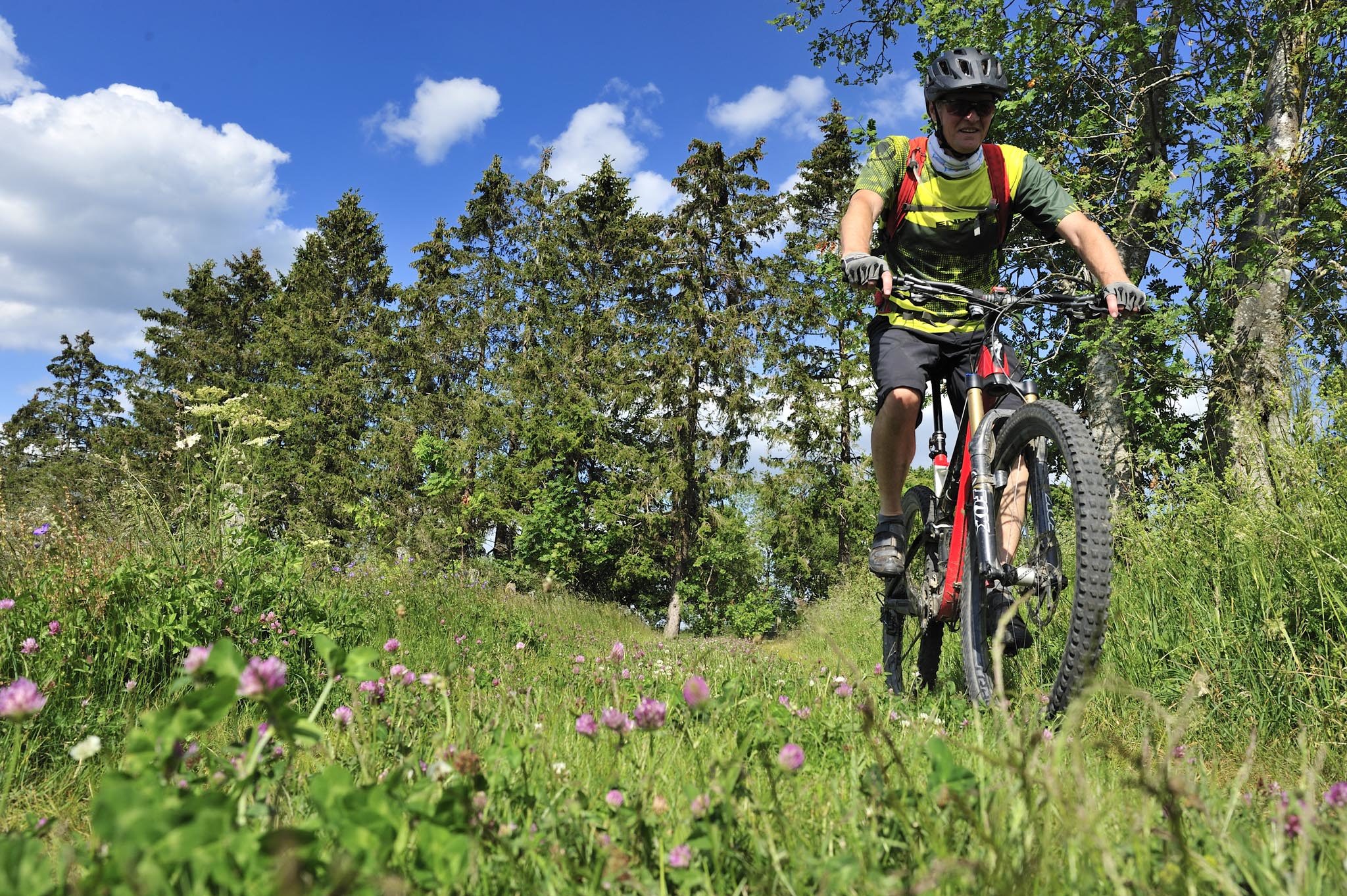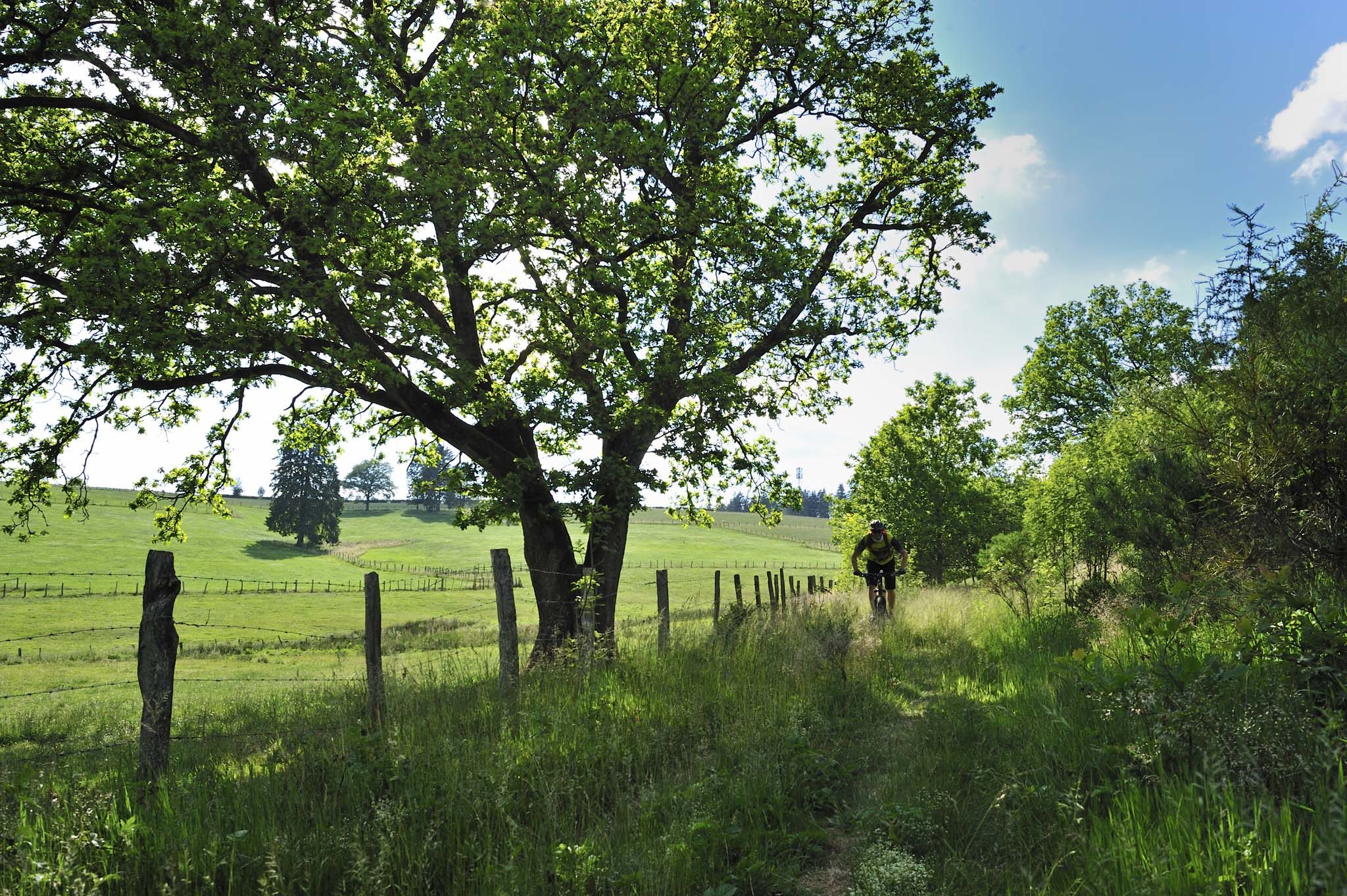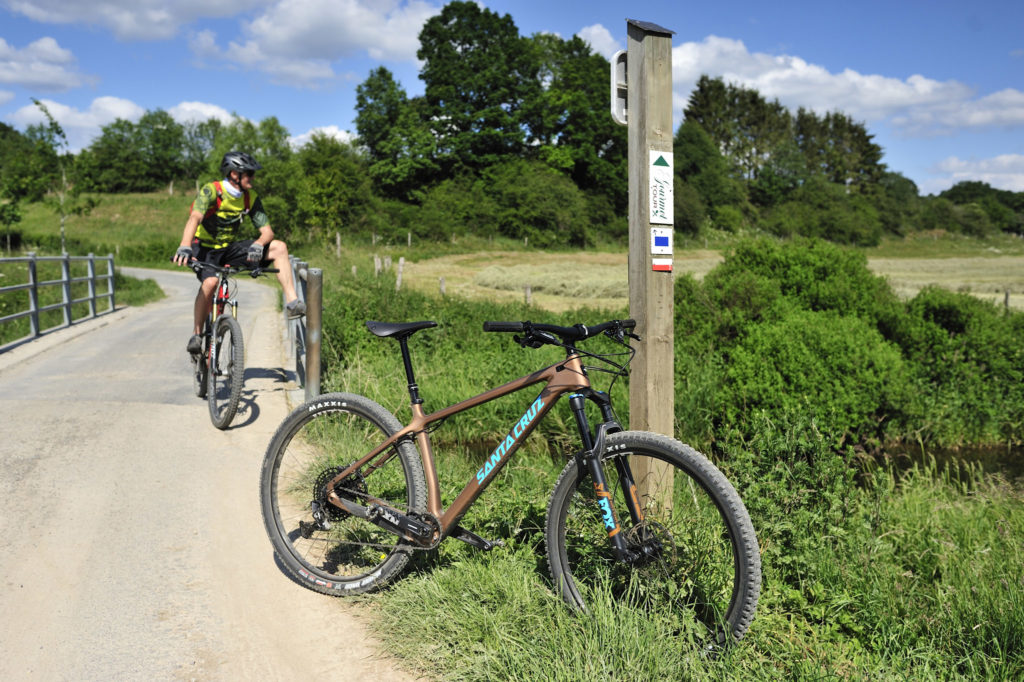 A Robertville, les haies vives, les prés de fauche rythment notre vitesse : nous roulons dans un autre paysage, ne correspondant guère à l’image que l’on se fait de l’Ardenne recouverte de forêts : ici tout n’est que foisonnement de baies et de champs fleuris. Je profite de la relance de mon Santa Cruz Chamelon pour titiller Dany et accélérer le rythme. Tout au long de ces grandes prairies, il faut profiter des chemins rectilignes pour augmenter quelque peu la moyenne : boucler les 170 km du Stoneman en une journée, voire deux est loin d’être une sinécure…