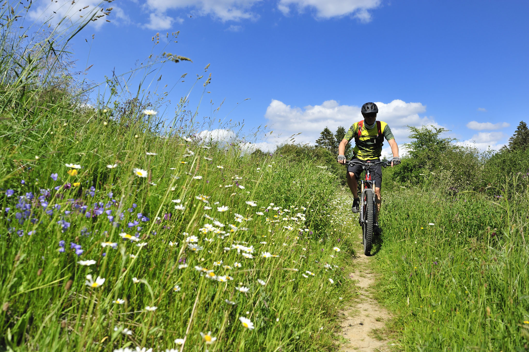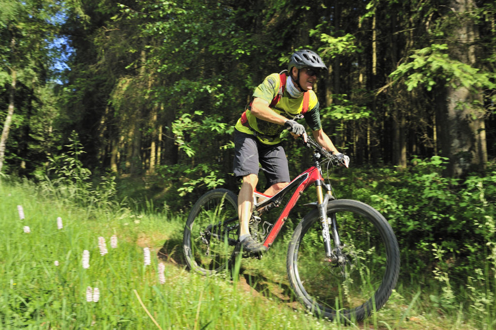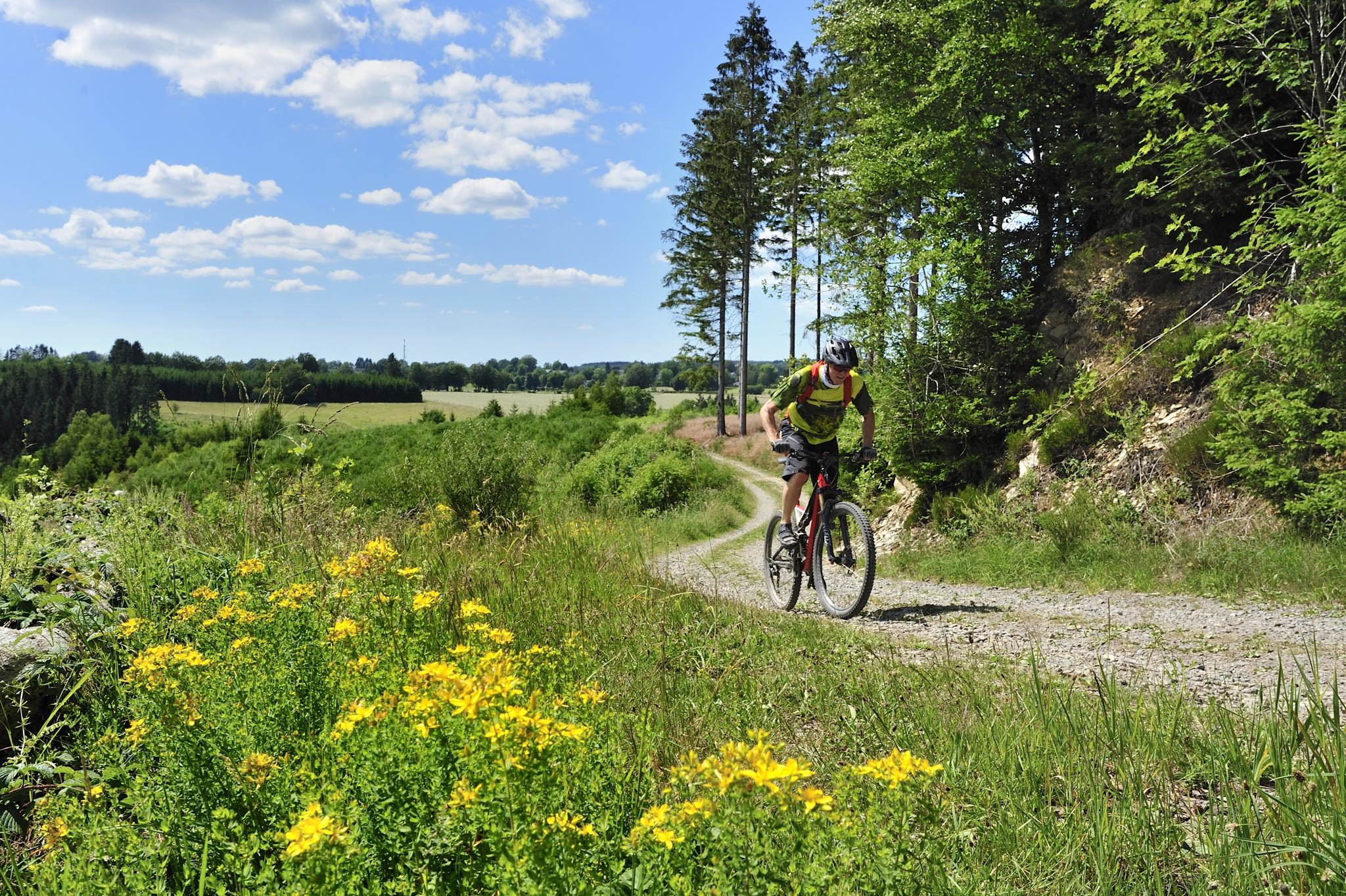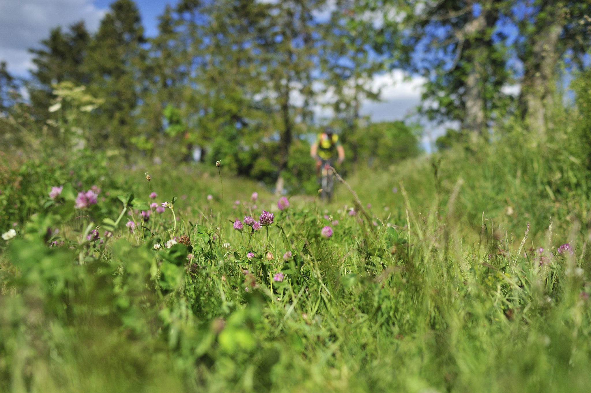 A Robertville, les haies vives, les prés de fauche rythment notre vitesse : nous roulons dans un autre paysage, ne correspondant guère à l’image que l’on se fait de l’Ardenne recouverte de forêts : ici tout n’est que foisonnement de baies et de champs fleuris. Je profite de la relance de mon Santa Cruz Chamelon pour titiller Dany et accélérer le rythme. Tout au long de ces grandes prairies, il faut profiter des chemins rectilignes pour augmenter quelque peu la moyenne : boucler les 170 km du Stoneman en une journée, voire deux est loin d’être une sinécure…