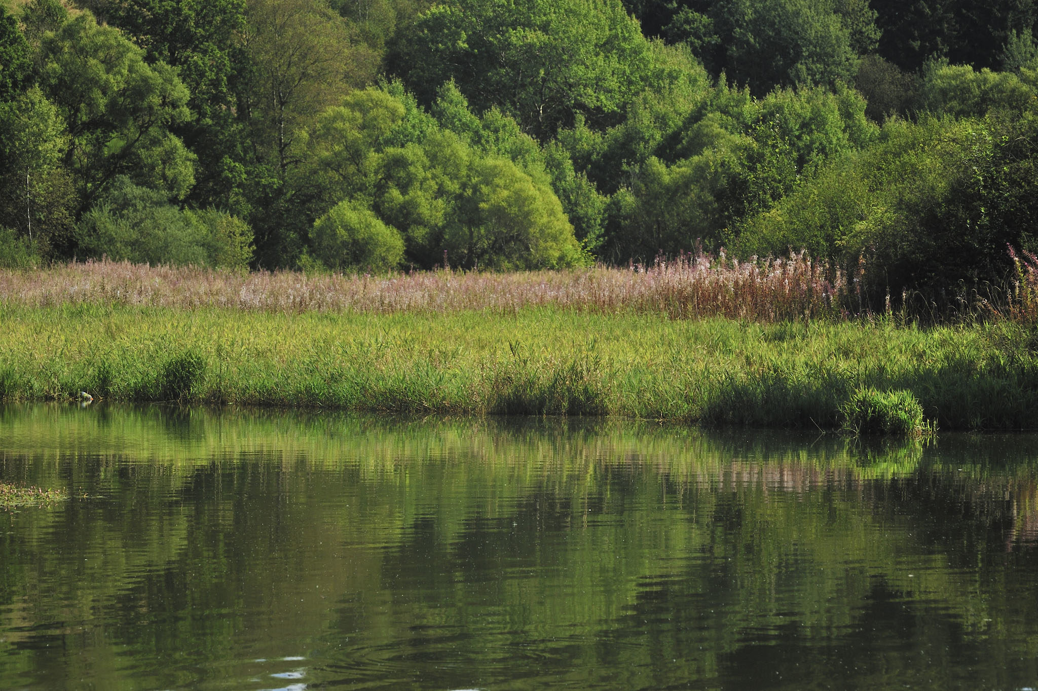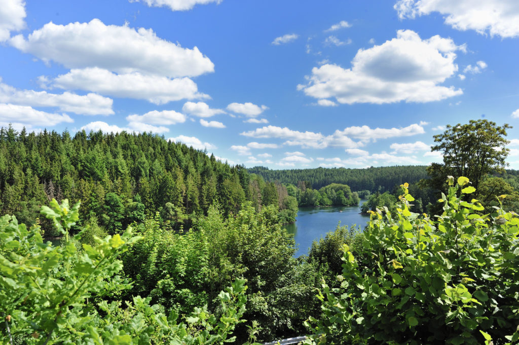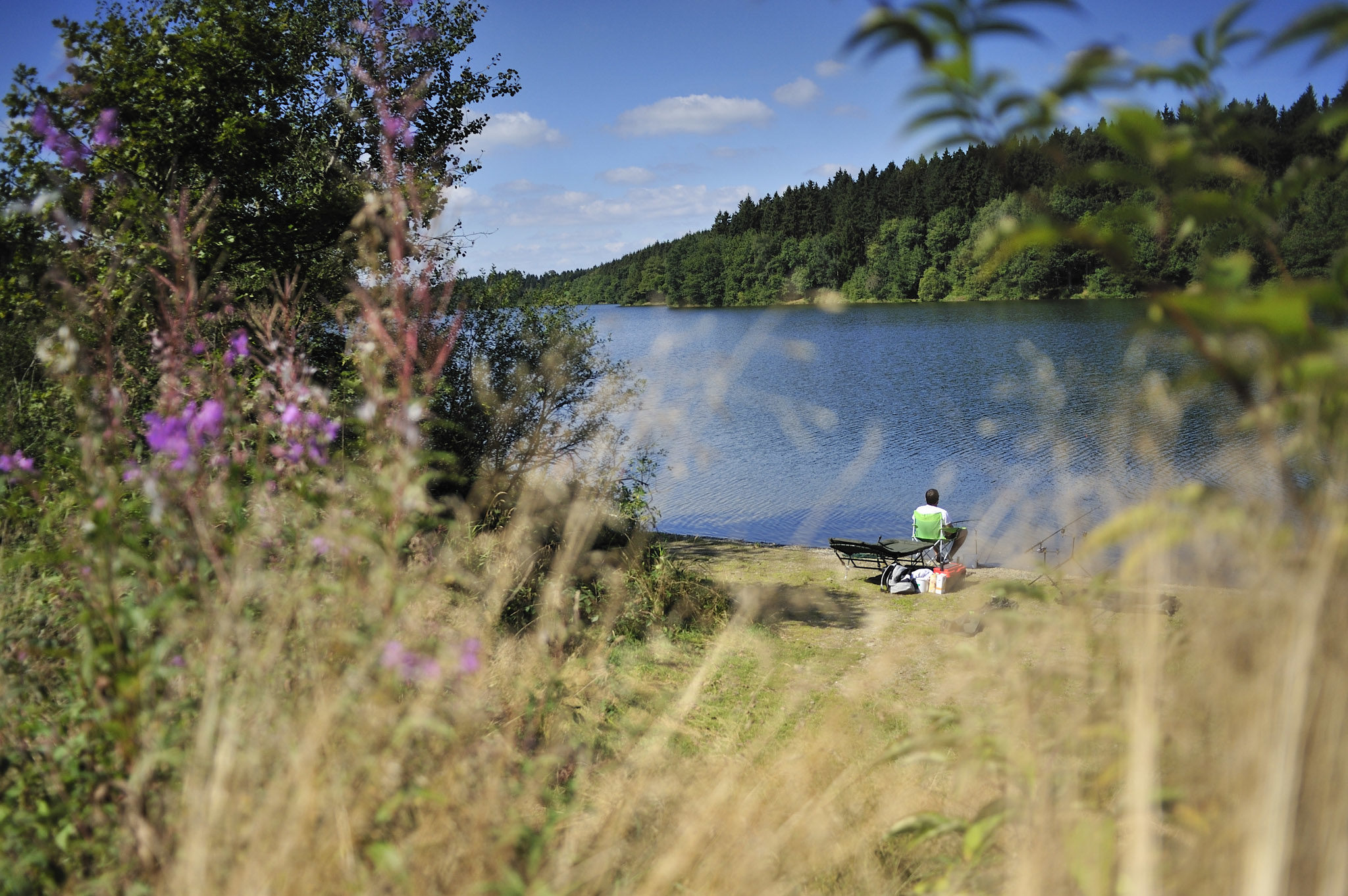 Au bout de l’horizon apparaissent les rives du lac de Bütgenbach. Nous plongeons dans un autre décor, à défaut de ne pas avoir le temps de barboter dans ces eaux si séduisantes : criques, bras du lac ou prés de fauche, comme celui de la Réserve naturelle de la Holzwarche qui possède des plantes endémiques des Alpes, tel le fenouil ou la centaurée noire. Avec le ciel azur se reflétant sur l’étendue miroir de Butgenbach, la lumière est sublime. Parfois, le chemin se substitue à un single qui court à travers des prés humides.