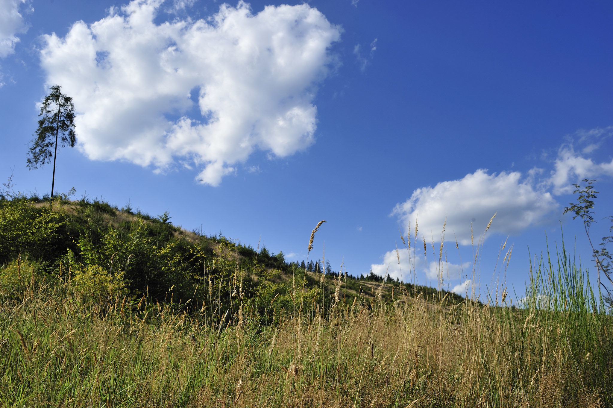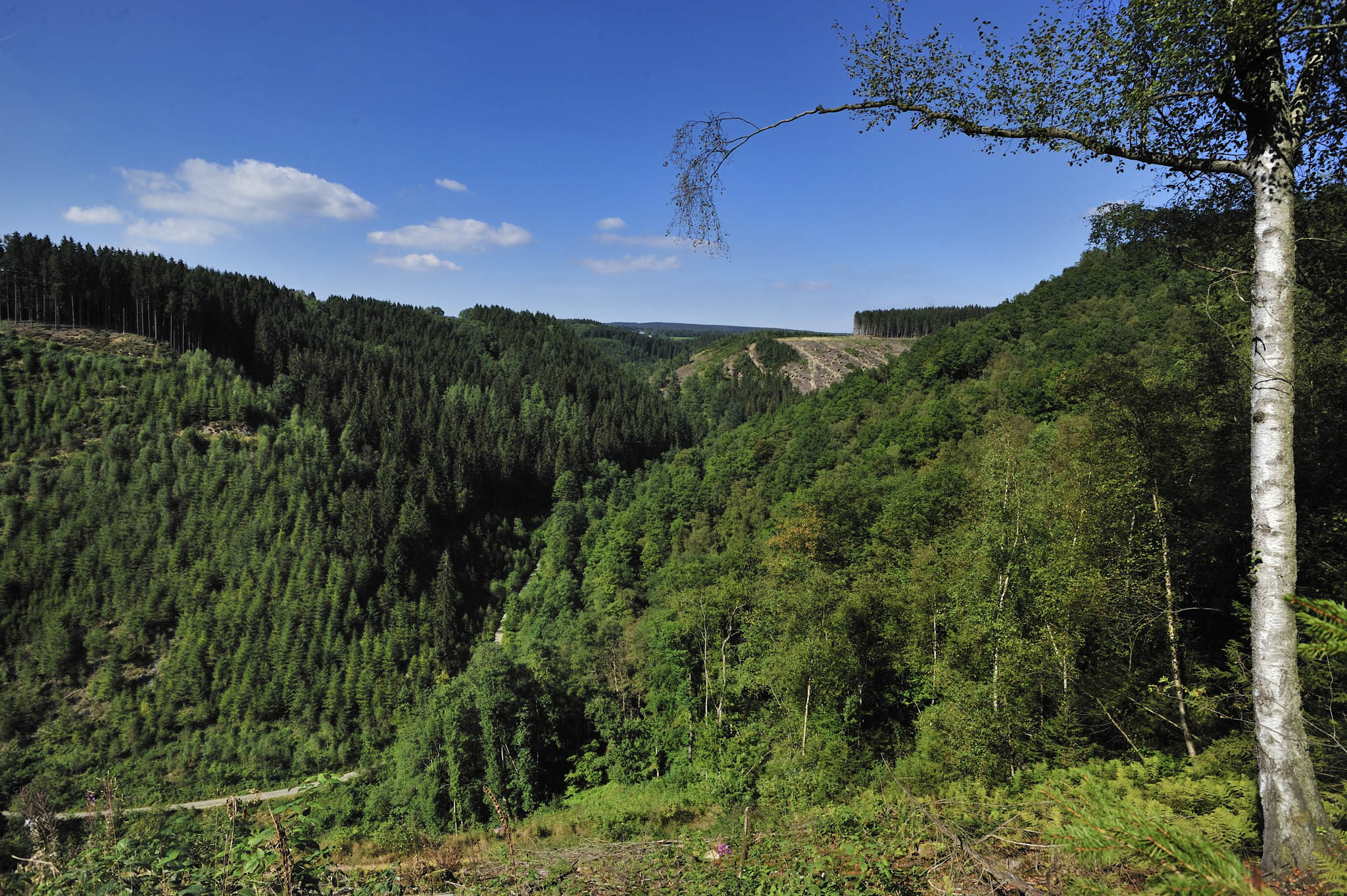 Protégée des vents dominants par son encaissement, la petite vallée est chaude : on se croirait sur un chemin du Sud. Alors que je me crois presque arrivé au pied de la l’Our, en face, une côte se lance vers le ciel : abrupte et redoutable, elle m’arrache les poumons. Dany me précise qu’elle n’est qu’un hors d’oeuvre pour toutes les autres qui sillonnent la vallée de l’Our. L’obtention du trophée se jouera certainement ici, sur les contreforts de la vallée encaissée. Mais au sommet, quel plaisir d’admirer le paysage. La vue qui s’étend au-delà de la frontière n’est qu’une succession de collines et de vallées encaissées : l’Eifel, cet autre massif forestier, prend le relais de l’Ardenne.