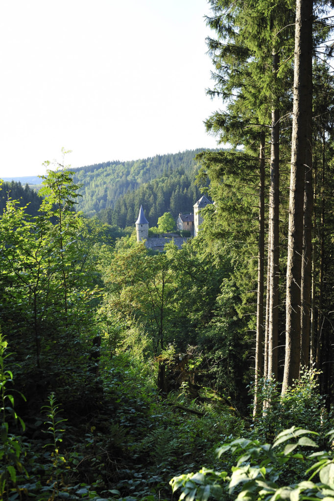 À un croisement, nous le laissons partir dans sa fureur de vivre où il ira mourir dans les eaux de la Warche, quelques kilomètres plus bas. Pour notre part, nous roulons sur une des rares routes qu’emprunte le Stoneman : elle nous permet de passer dans une autre vallée, celle où trône un château moyenâgeux. Suspendu entre ciel et terre sur son éperon rocheux, Reinhardstein se fond dans son paysage forestier.