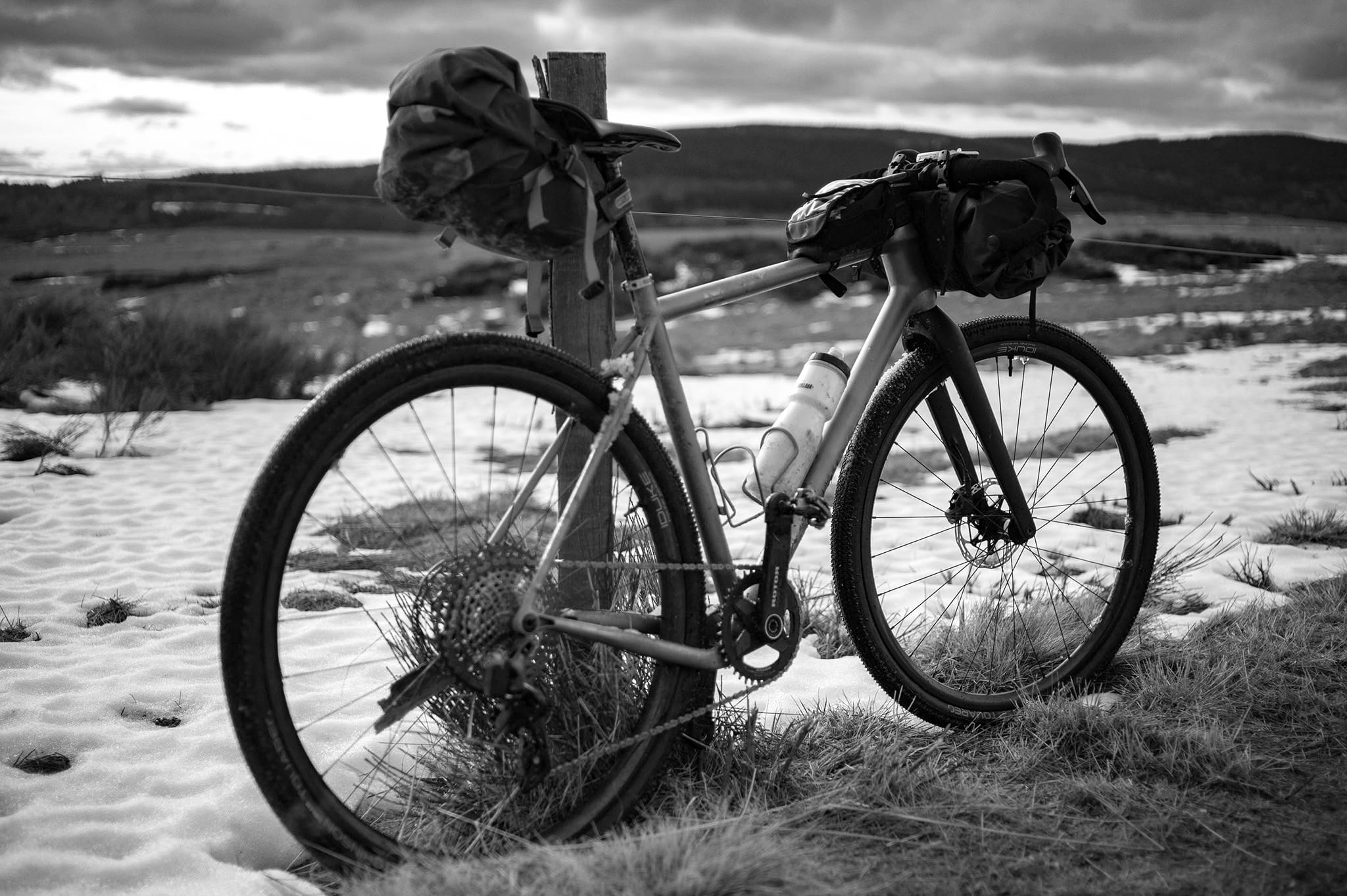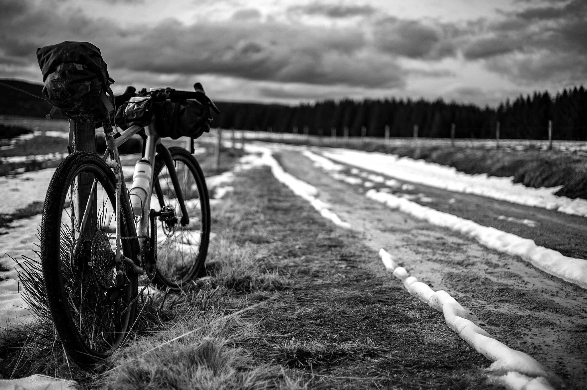 Plus nous montons, plus la neige s’invite sur le chemin. A tel point qu’il nous est impossible de poursuivre la route à vélo. Un long portage s’annonce : il va durer jusqu’au crépuscule.