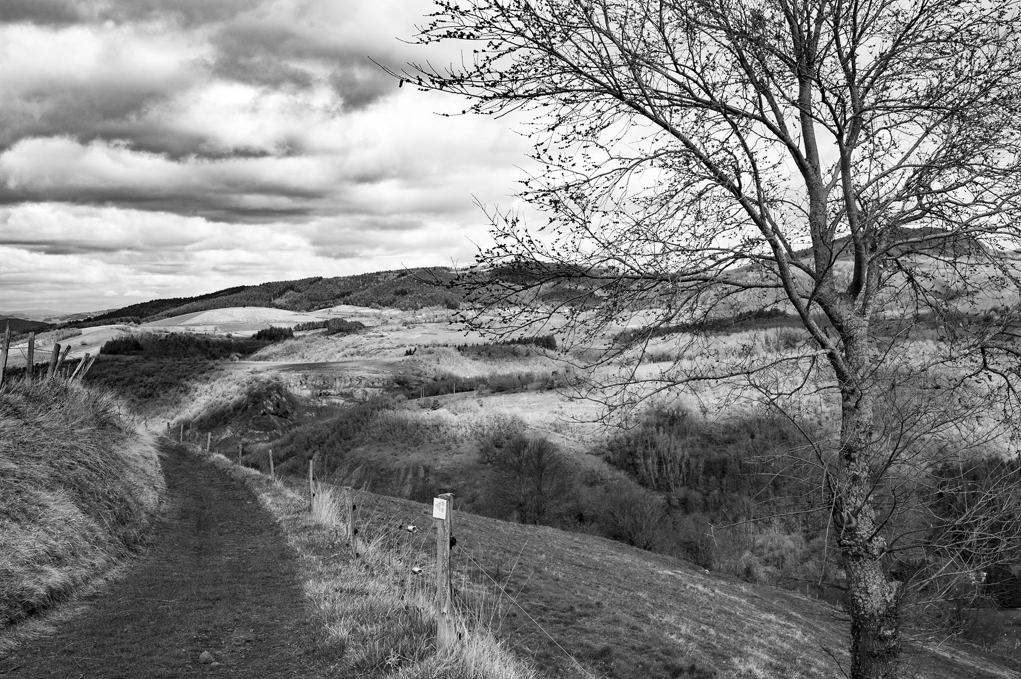 Le chemin surplombe les gorges de l’Allier. Au-dessus des Châzes, le chemin traverse l’un des plateaux où est clairsemé l’habitat. A la croix, nous prenons la trace qui descend vers l’Allier en dessinant les épingles les plus abruptes.