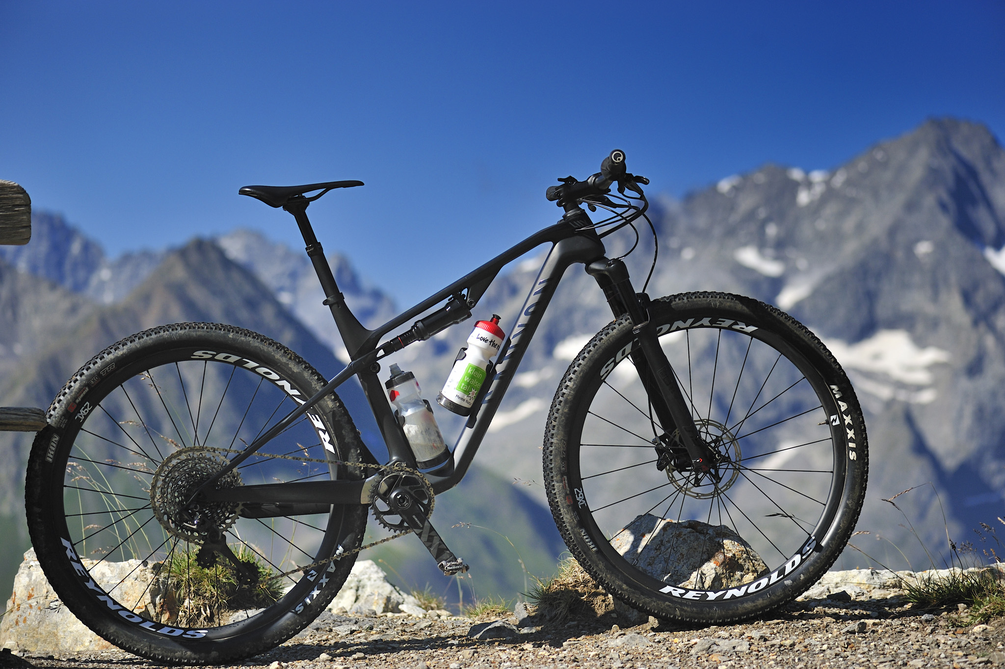 Je suis entraîné par la pente, le poids me pousse vers le bas mais l’équilibre, la stabilité du VTT m’étonnent : je lâche les freins vers l’Alpe du Lauzet mais me méfie des pneus Maxxis Ikon qui offrent peu de prises latérales…