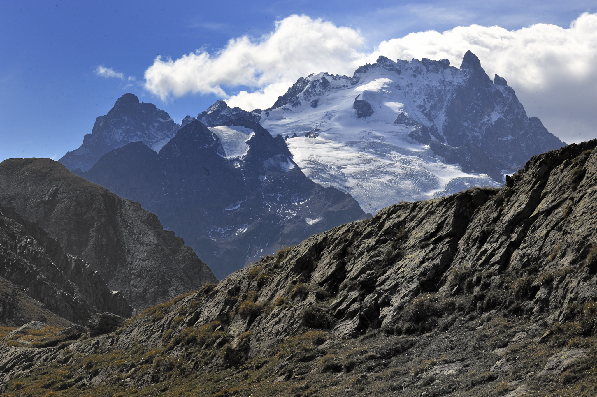 Le matin du deuxième jour, depuis le village des Hières, nous commençons à grimper vers le plateau du paradis, via un long et interminable chemin. Dès que l’on s’élève de la Romanche, c’est la découverte d’un monde de lumière où se mêlent les glaciers et les lacs bleus. Le plateau s’ouvre vers l’Oisans, cette montagne cristalline où trône la Meije, face à nous, à presque la toucher.