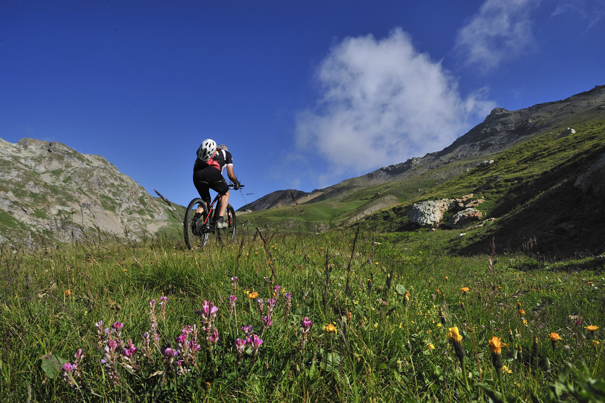 Un virage à gauche et nous glissons à toute allure sur un single à travers l’alpage du plateau d’Emparis. Un plaisir des yeux et des sens. Mais cette euphorie ne peut trahir la moindre erreur de pilotage. Jean-Paul me conseille à la prudence. « C’est pourtant ici que l’on constate les chutes les plus sévères. Sur cette trace, on se relâche et on va vraiment vite… »