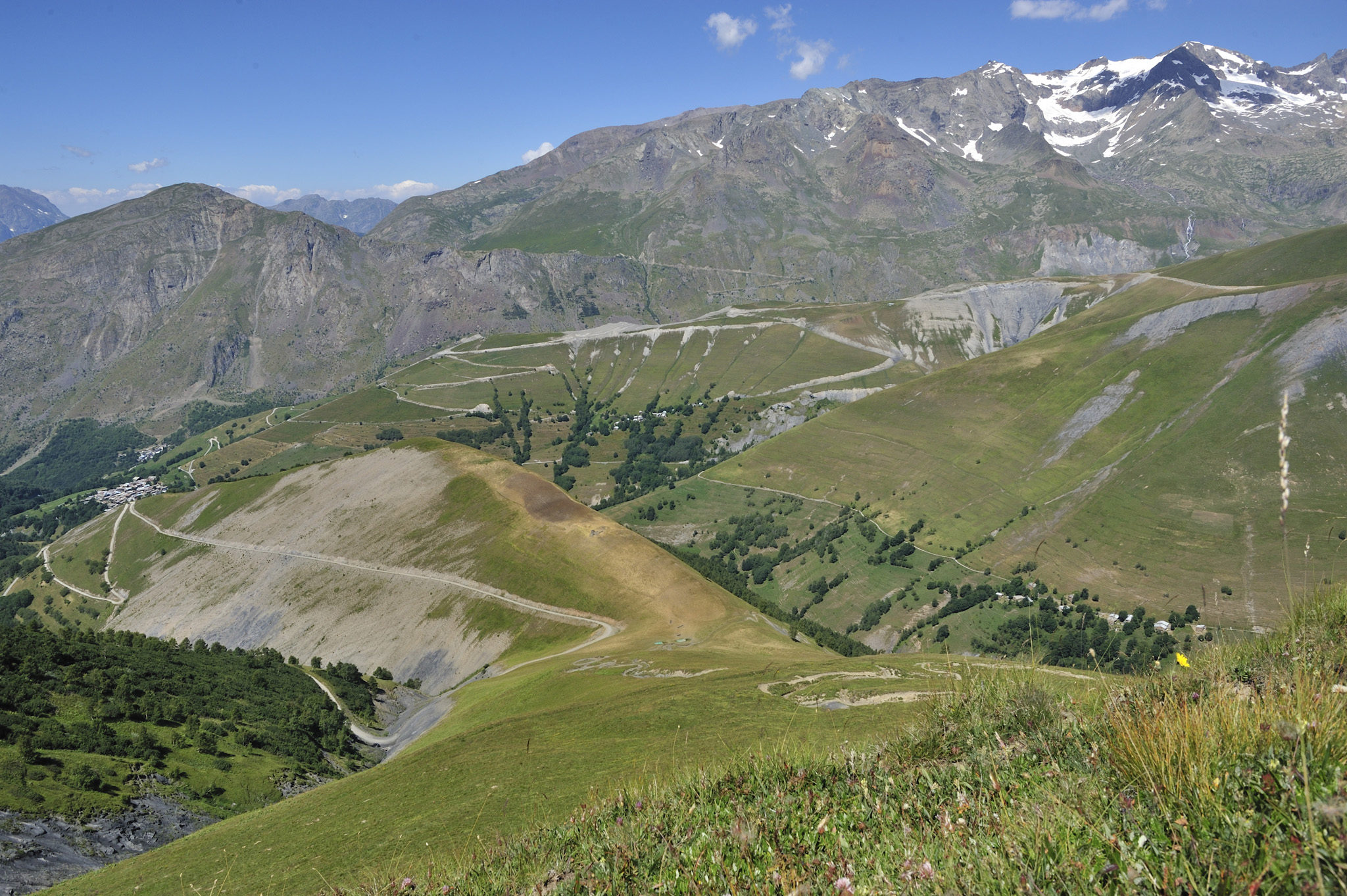 Retour vers le Lautaret puis le magnifique panorama au Pontet. Les 2500 m de dénivelé de la journée sont bouclés. Peu de choses finalement, comparé au raid que les concurrents devront franchir le 15 septembre. Et Jean-Paul me montre la suite du parcours, dessiné dans le paysage. « Nous, on en a terminé pour aujourd’hui, mais regarde là, la montagne au sud-est. Les concurrents devront passer dans un tunnel privé, long de 2 km, pour passer sous la montagne et rejoindre le Plan de l’Alpe, à la porte du Parc National des Ecrins. De là, ils longeront la vallée pour remonter jusqu’ici, au lac du Pontet… ». Je pense à leur baroud de champion en profitant une dernière fois d’une superbe descente vers Vallfroide, blotti dans sa vallée secrète. J’observe le terrain. Par des efforts obstinés, l’homme a conquis ce versant, le découpant en terrasse pour tenter de cultiver sur ces flancs abrupts une terre ingrate.