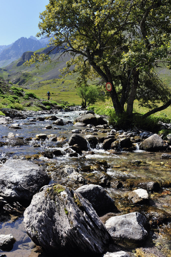 Du col, un single track aérien se faufile entre les rocs lacérés. Sur mon tout nouveau Canyon Lux, je la joue mollo et me fais très rapidement distancer par les deux as. Et la descente ne fait que débuter : elle sera rapide et technique. Je roule sur de vrais sentiers, mettant en exergue l’attention et les bons réflexes que tout biker doit avoir en montagne. Contournant la Roche Olvéra, nous traversons les gués, enchaînons le single à flanc du torrent. C’est magnifique et grisant. A 1758 m d’altitude, la chaleur se manifeste : nous avons dégringolé en quelques minutes près de 900 m de dénivelé. Et là-haut, le col de la Ponsonnière me nargue, juché à 2682 m d’altitude…