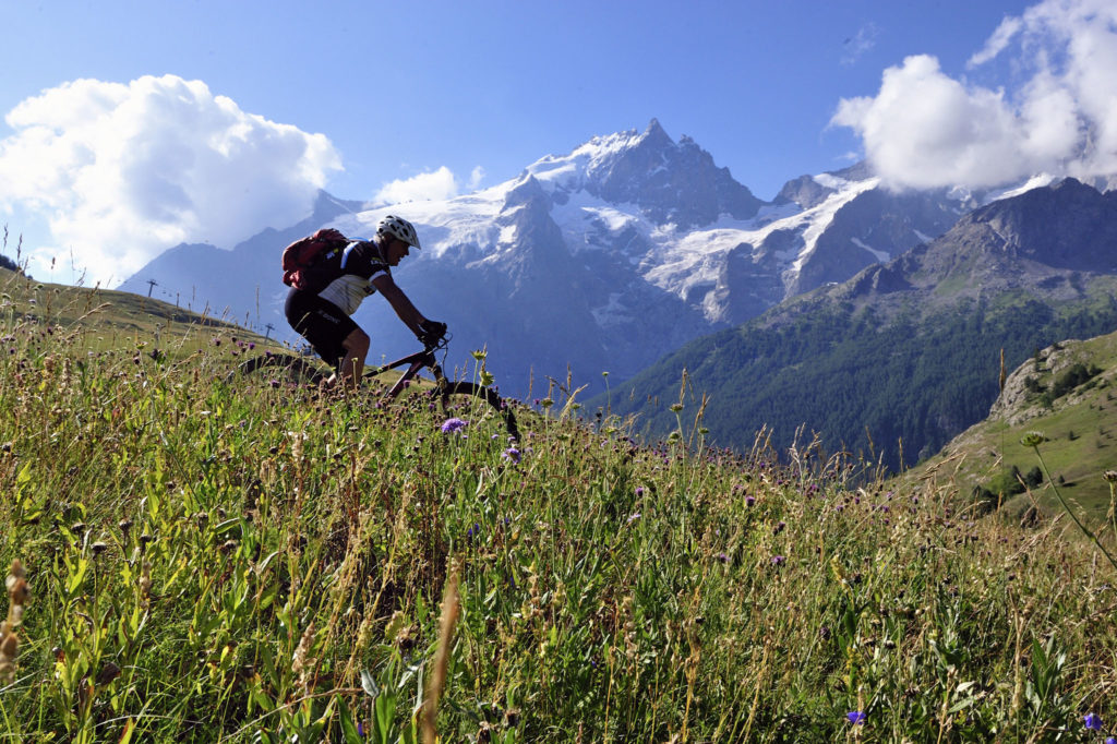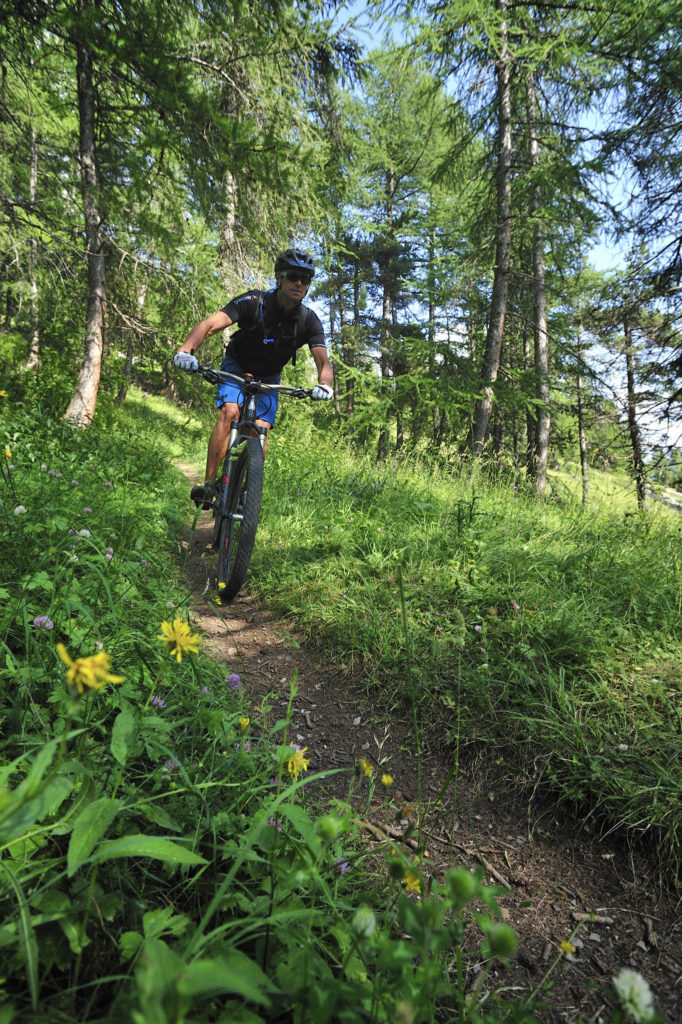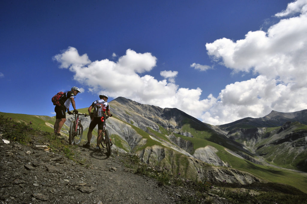 Un virage à gauche et nous glissons à toute allure sur un single à travers l’alpage du plateau d’Emparis. Un plaisir des yeux et des sens. Mais cette euphorie ne peut trahir la moindre erreur de pilotage. Jean-Paul me conseille à la prudence. « C’est pourtant ici que l’on constate les chutes les plus sévères. Sur cette trace, on se relâche et on va vraiment vite… »