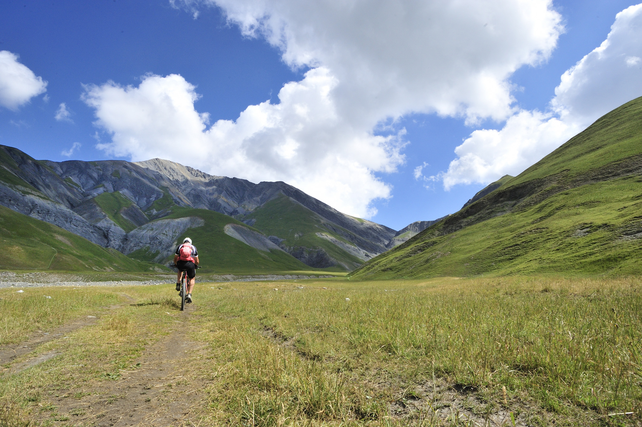 De la piste menant au camp des Rochilles, sur la droite, s’échappe un sentier à flanc de la combe. Je joue aux équilibristes mais ne crains pas de toucher les pédales sur un rocher grâce à cette trace dépourvue de pièges. Le sentier, lisse et beau, m’autorise à regarder le paysage : en face, le massif des Cerces est pétri dans du calcaire dolomitique.