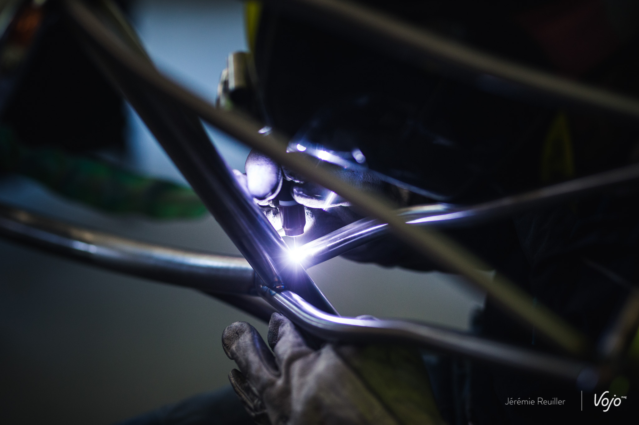 « Comme pour nos autres vélos titane, les tubes titanes de l’AllRoad sont actuellement fournis par Dedacciai (aciériste italien), précise Brice. Il s’agit de tubes aéronautiques standardisés ASTM B338. Les manchons composites, eux, sont obtenus par moulage (injection à chaud) d’un polyamide chargé à 30% de fibres de carbone longues. La forme de leur zone de contact avec les tubes a été brevetée pour résoudre la problématique du sur-mesure, faciliter et permettre un double encollage et assurer une résistance équivalente à nos cordons de soudure fins. »