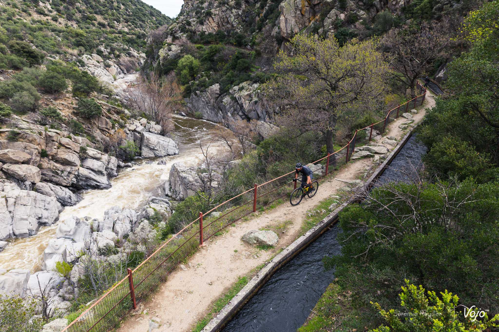 Morceau de bravoure inoubliable de ce trip : le roulage de nuit, à la lumière des frontales, le long du canal nous ramenant à Ille-sur-Têt. 20 kilomètres à rigoler sous quelques ondées, à improviser, pour faire durer le plaisir de rouler jusqu’au bout, à suivre la petite lampe rouge du vélo devant et à éclairer au mieux le chemin pour ceux qui suivent.