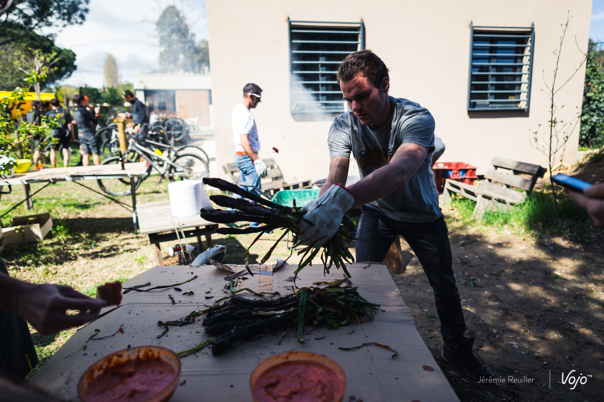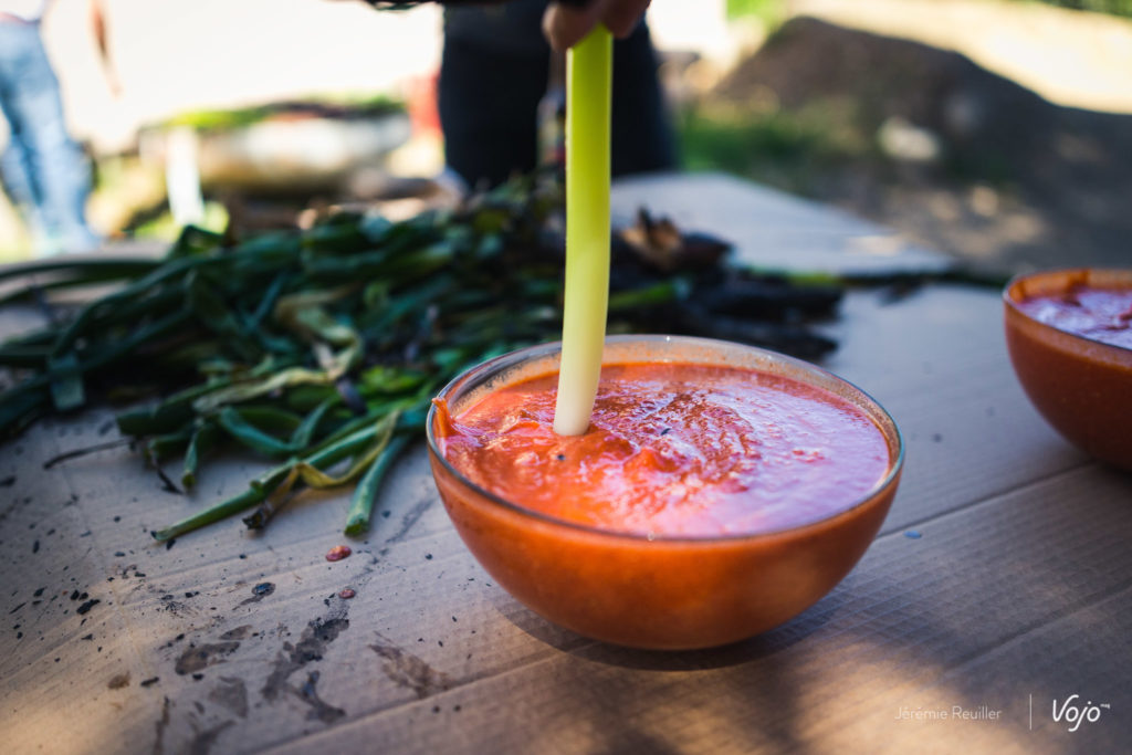 Le côté vegan, low calories, tout ça, c’est pas trop le genre de la maison ! Ici encore, un seul objectif : plaisir et convivialité. Geoffroy, la dernière recrue de Caminade qui est aussi loin d’être un manche en cuisine, avait tout préparé : haricots tarbais à la tomate avec boulettes de viande, et l’incontournable barbecue de calçote (mi-oignons mi-poireaux qu’on déguste en les décalottant avant de les tremper dans une sauce à la tomate maison), arrosé de bières locales, ponctué de fromages de chèvre de la ferme d’à côté…