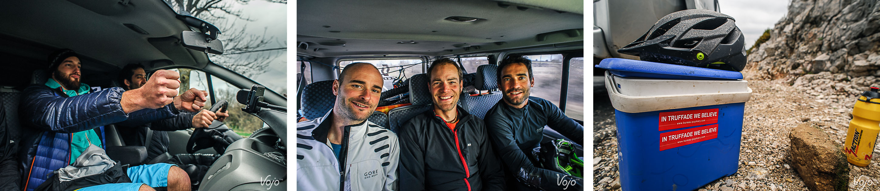 A peine arrivés, on mange un morceau en vitesse, on transfère les bikes dans la camionnette et c’est parti pour un premier ride de découverte avec la fine équipe de J-B (le guide, au volant), Thibaut (le grande barbu qui fait semblant de conduire…), Laurent (à gauche sur la banquette arrière), Nico (notre Vojo pilote/testeur/baroudeur qui a accompagné votre serviteur sur ce trip) et Rémy (à droite, qui est l’instigateur du raid).