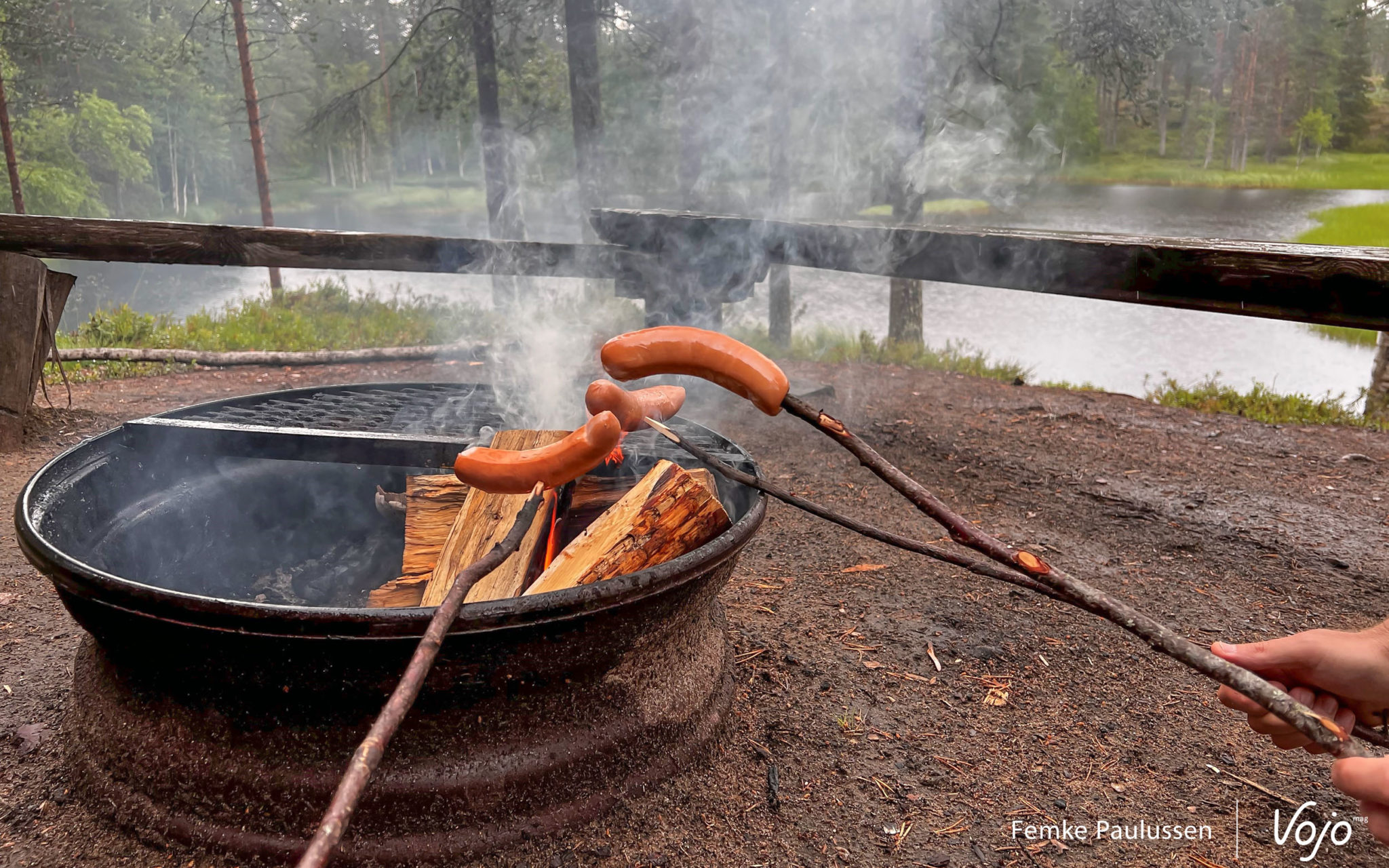 Nous sommes surpris par une énième averse et décidons de profiter pleinement de cet abri au bord du lac. Enthousiastes comme nous le sommes, nous tentons frénétiquement de faire rôtir des saucisses dans le feu (apparemment une tradition finlandaise). Par une belle journée d’été, nous reviendrons certainement ici pour faire un plongeon rafraîchissant dans le lac.