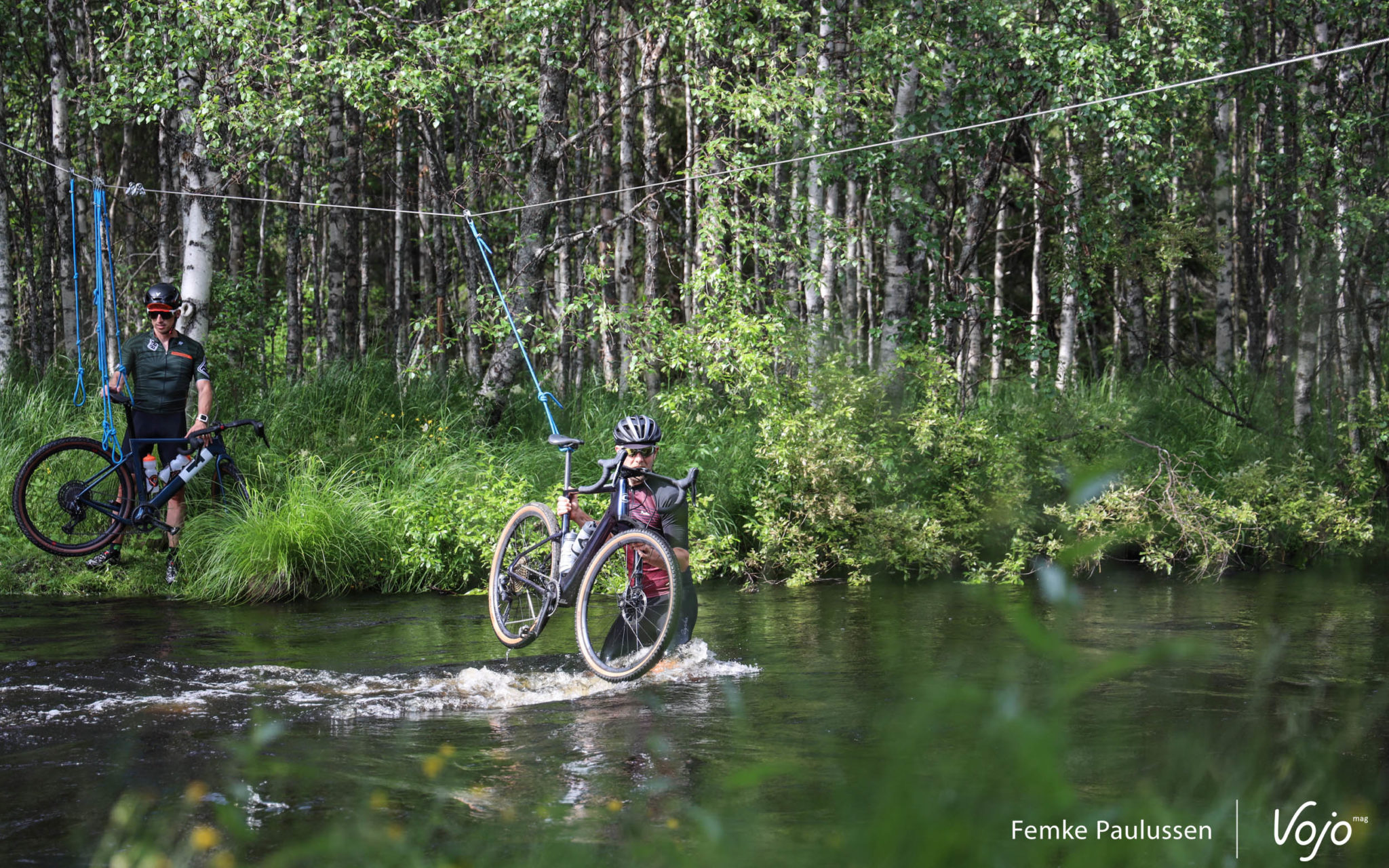 Dans nos contrées, il est généralement possible de traverser un ruisseau sur le vélo directement, en y allant de manière précautionneuse. L’histoire est tout autre ici : le lit est trop profond et le courant beaucoup trop fort. Nous attachons notre Cannondale Topstone à la selle avec la boucle de la corde et faisons un pas de côté dans la rivière. En réalité, nous devons nous pencher fortement en arrière pour faire face au fort courant. « Il vaut mieux garder vos chaussures, sinon vous n’aurez pas assez d’adhérence sur les pierres glissantes« , ajoute Lieven en guise de conseil. Un conseil avisé d’un expert par expérience, que nous suivons bien sûr. Heureusement, nos chaussures (les Quoc Gran Tourer II : lire Dossier | 7 paires de chaussures gravel au banc d’essai) sont munies d’un caoutchouc plutôt adhérent, ce qui nous permet de rejoindre l’autre rive assez facilement.