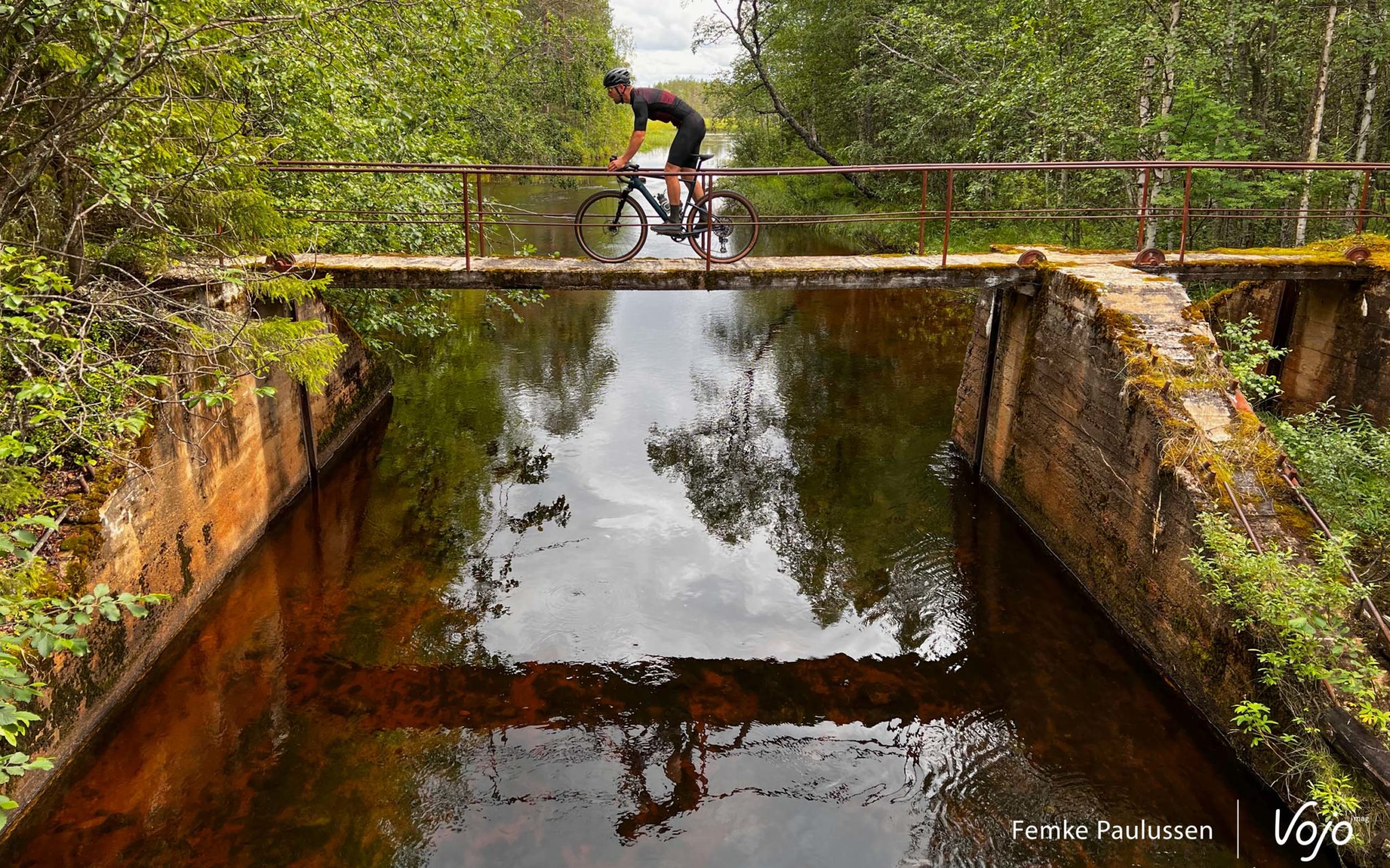 Voilà que nous tournons à gauche dans un chemin bien plus étroit. Nous nous faufilons habillement entre des racines d’arbres glissantes avec ce préssentiment que quelque chose de spécial nous attend. Et notre guide Lieven, engagé pour ce voyage auprès du Bike Hotel, nous confirme cela avec joie. La Finlande est pleine de lacs et de rivières, et la traversée d’une rivière ne semble pas loin.