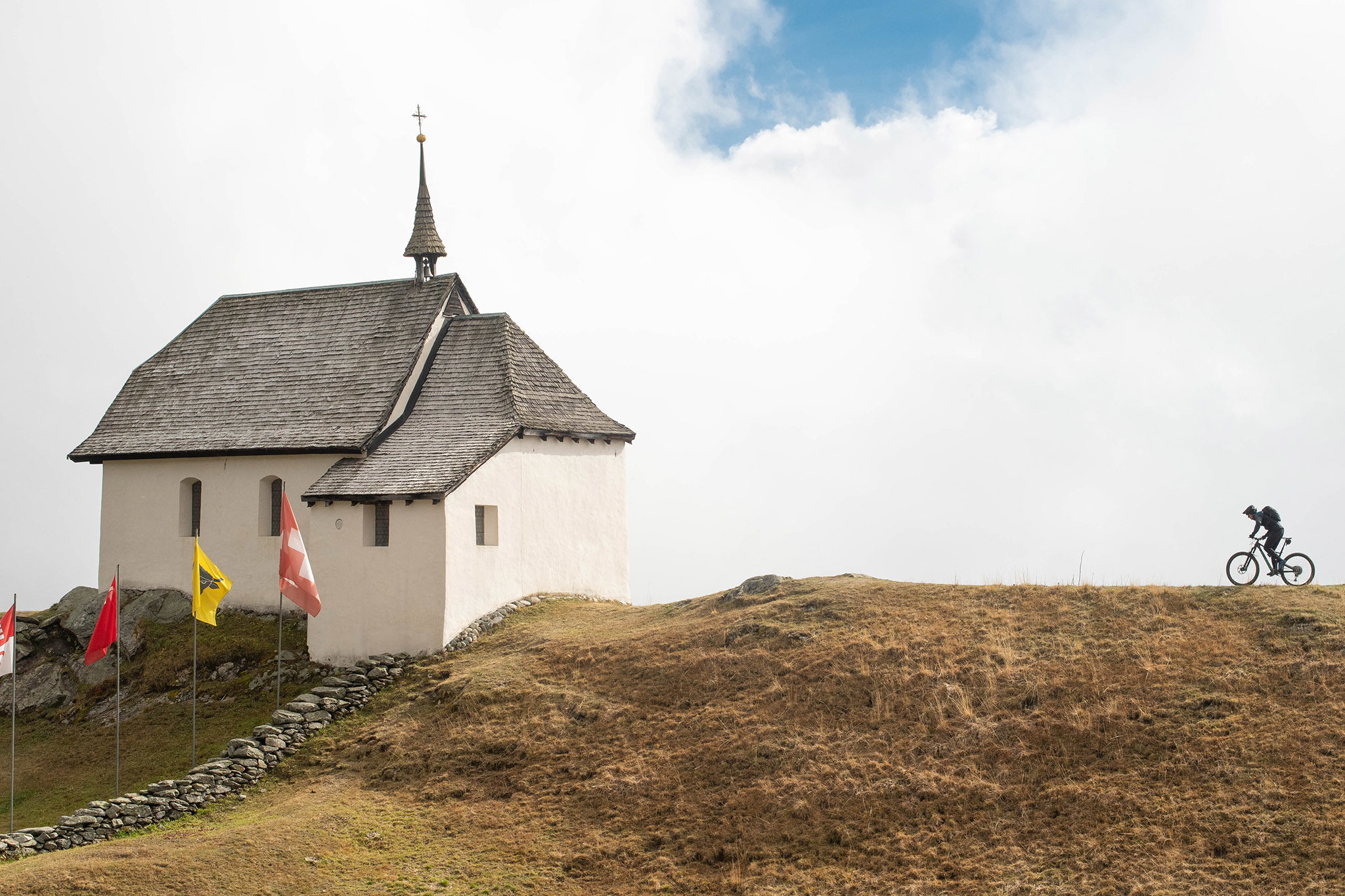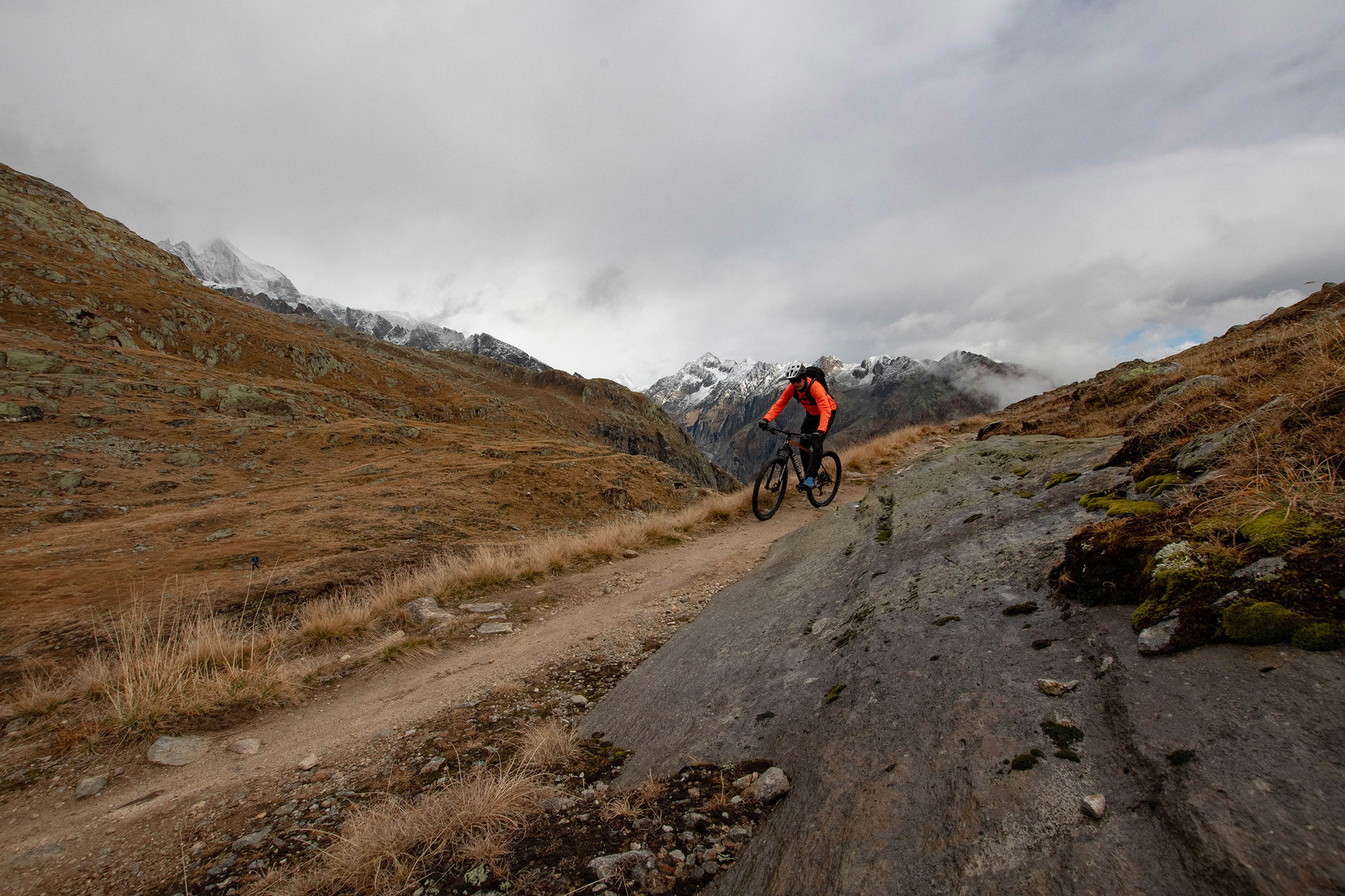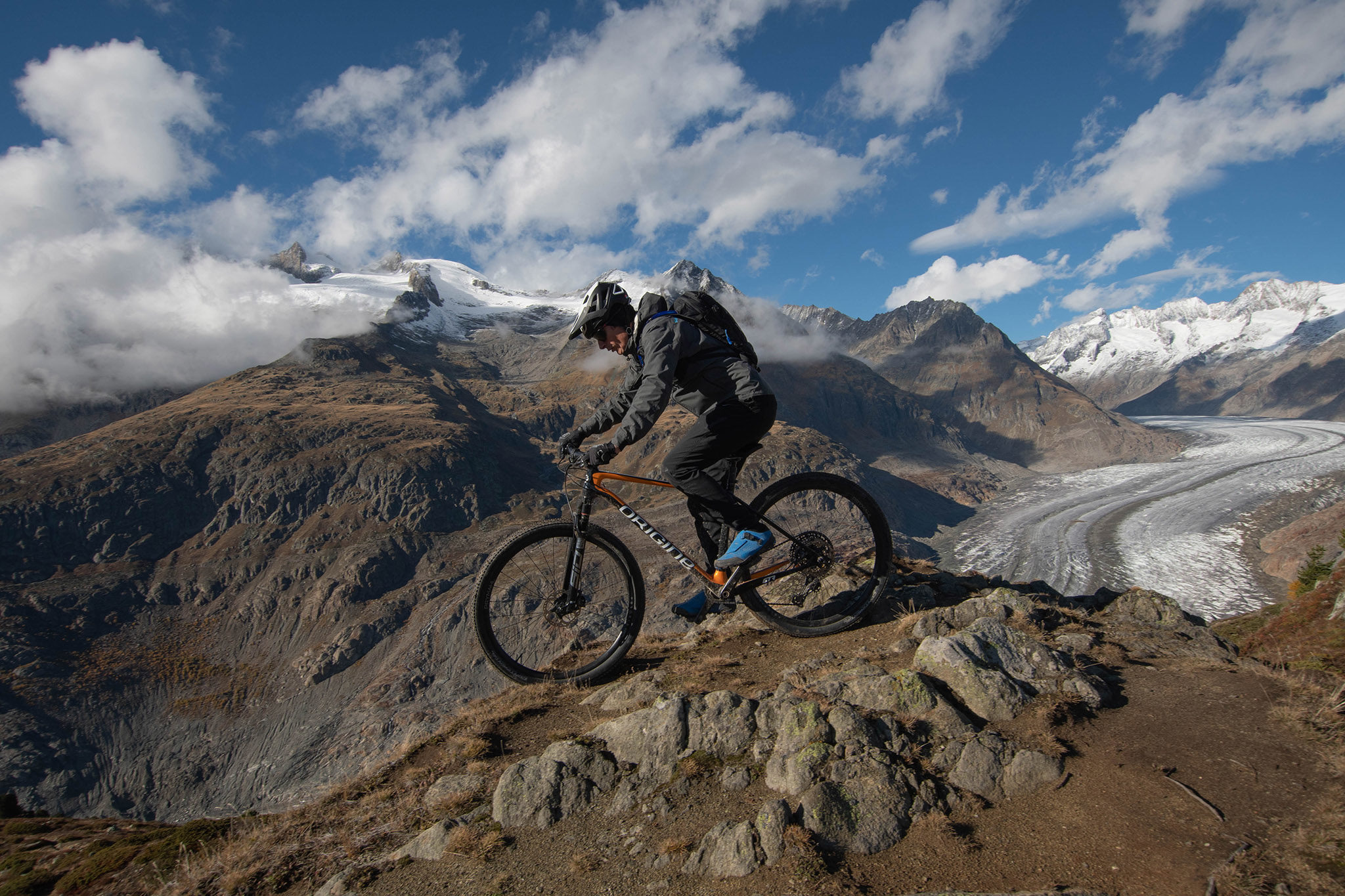 La lumière dure du soleil de l’été s’est adoucie depuis quelques semaines dans le Haut-Valais et elle illumine les versants de la montagne de tonalités chaudes et diffuses. En altitude, les vaches et les brebis sont redescendues suite au premier coup de froid. Dans la région de l’Aletsch Arena, doucement la fin de saison approche. Cette période est l’occasion d’aller capter les ambiances d’automne et de rouler dans un environnement grandiose.