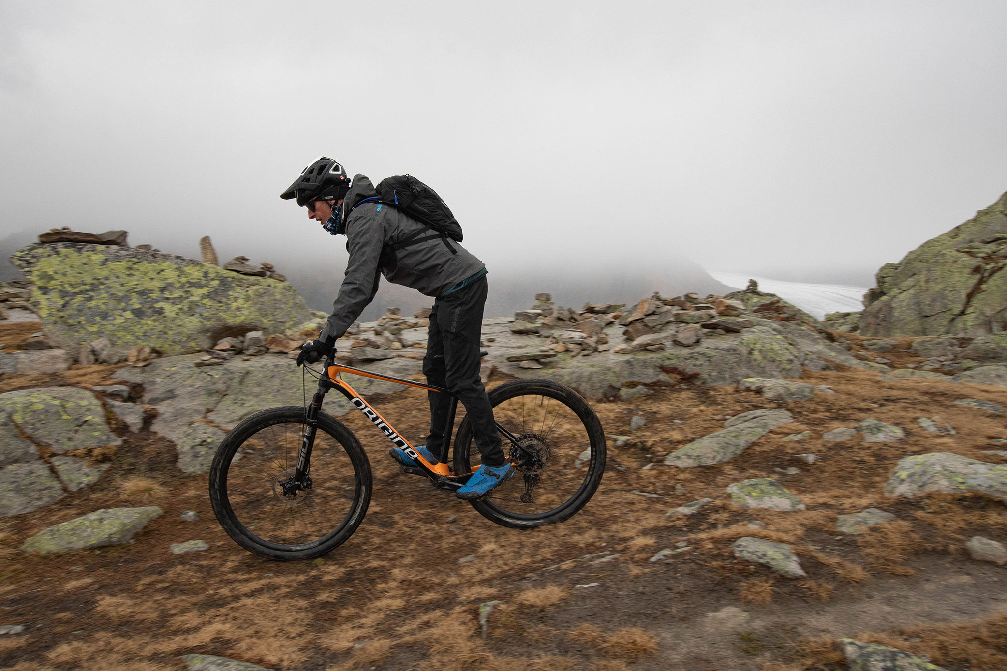 La dégringolade s’effectue sous une pluie mêlée à de la neige et la lumière commence à manquer pour distinguer les zones de relief sur le singletrack : la montagne se referme sur nous et l’appréhension nous submerge. Le sentier demande dextérité : Vincent ne s’en laisse pas compter et file dans la pente.