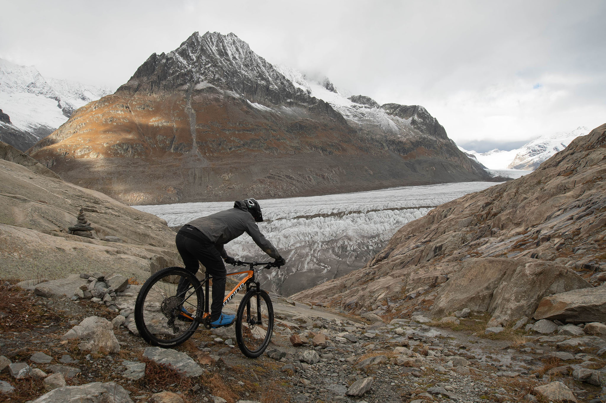 Face au glacier de l’Aletsch, nous ne sommes plus des vététistes mais des spectateurs d’une nature grandiose. Avec ses 86 kilomètres carrés, il s’agit du plus grand des Alpes. Le fleuve de glace, long de 20 km, relie les montagnes du Valais à l’Oberland. Epais de 800 mètres à son point le plus dense, il pourrait se comparer à une mini calotte glaciaire comme celle de l’Antarctique. Ce géant inscrit sur la liste du Patrimoine mondial de l’Unesco est cependant en sursis comme tous ses congénères des Alpes.