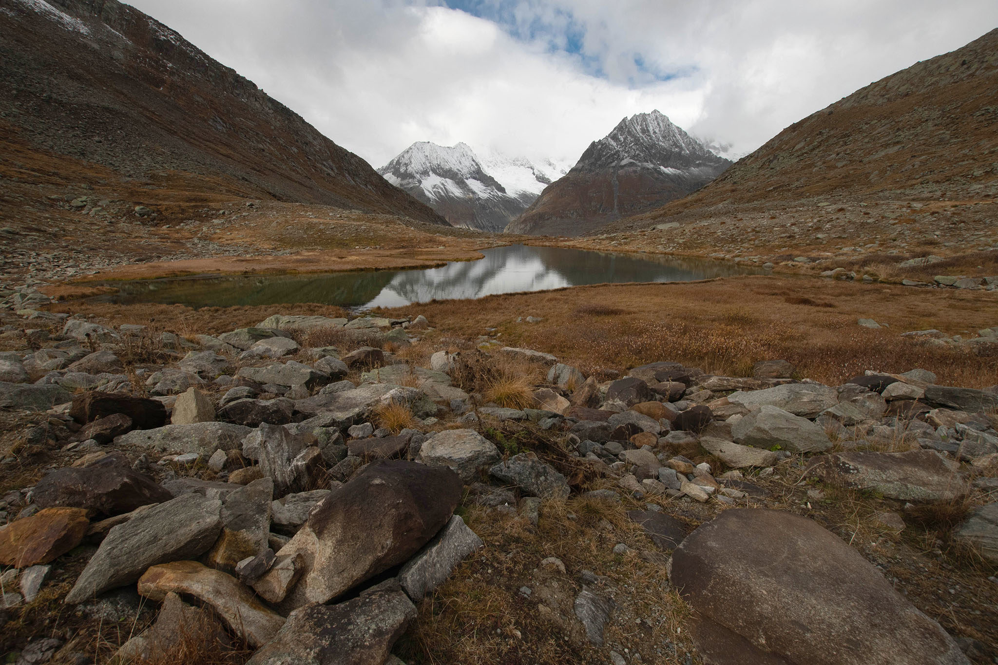 Devant nous, les entrailles de la terre s’ouvrent avec les tonalités des pierres et des minéraux et le ciel se confond avec les palettes grises et blanches des sommets : quel paysage nous offre le point de vue de Märjelensee !