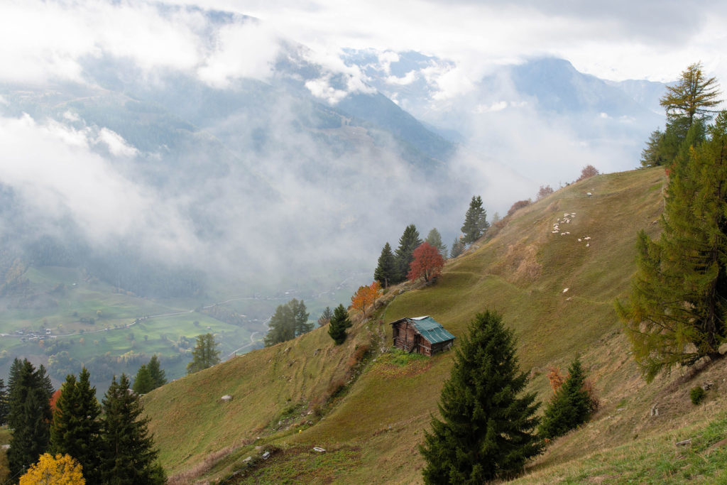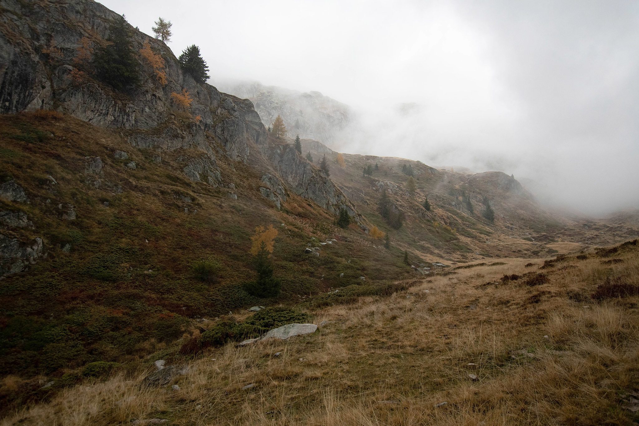 Les journées d’octobre sont plus courtes et changeantes. En une journée, en ces altitudes, on peut rencontrer les quatre saisons. Au matin, une fine pellicule de givre et de rosée recouvre l’alpage roussi par les premiers gels. La brume s’accroche sur les flancs du versant adret. Nous sommes dans un nuage : impossible de distinguer les contours de la belle montagne qui nous entoure. Nous plongeons résolument vers la forêt où nous pourrions retrouver de belles traces et réserverons des lendemains meilleurs pour les grands paysages.