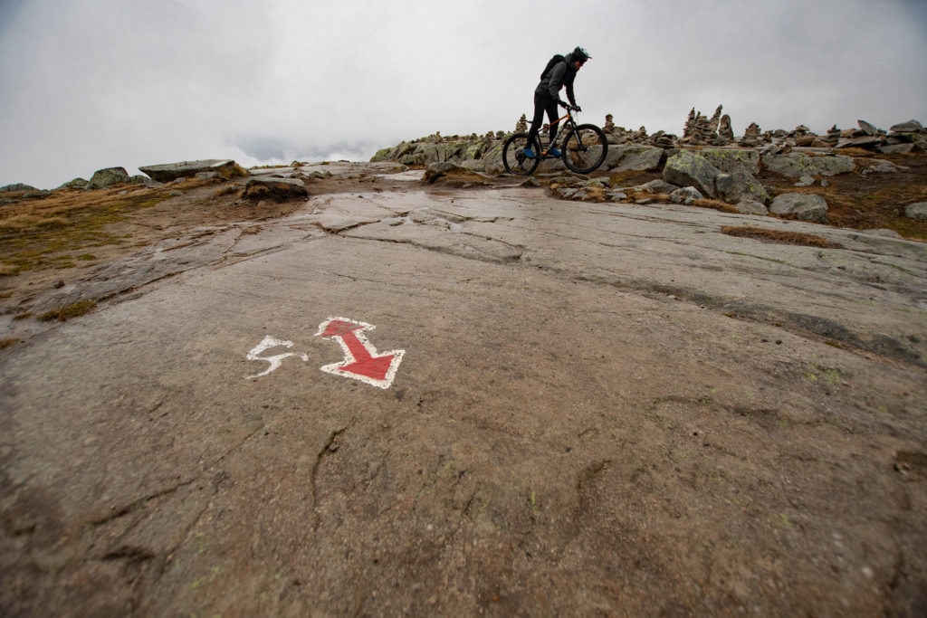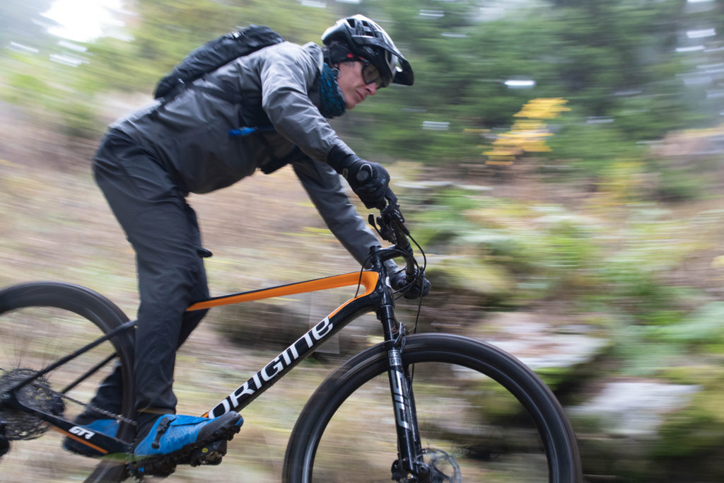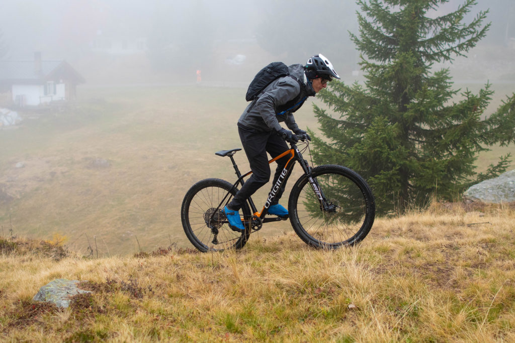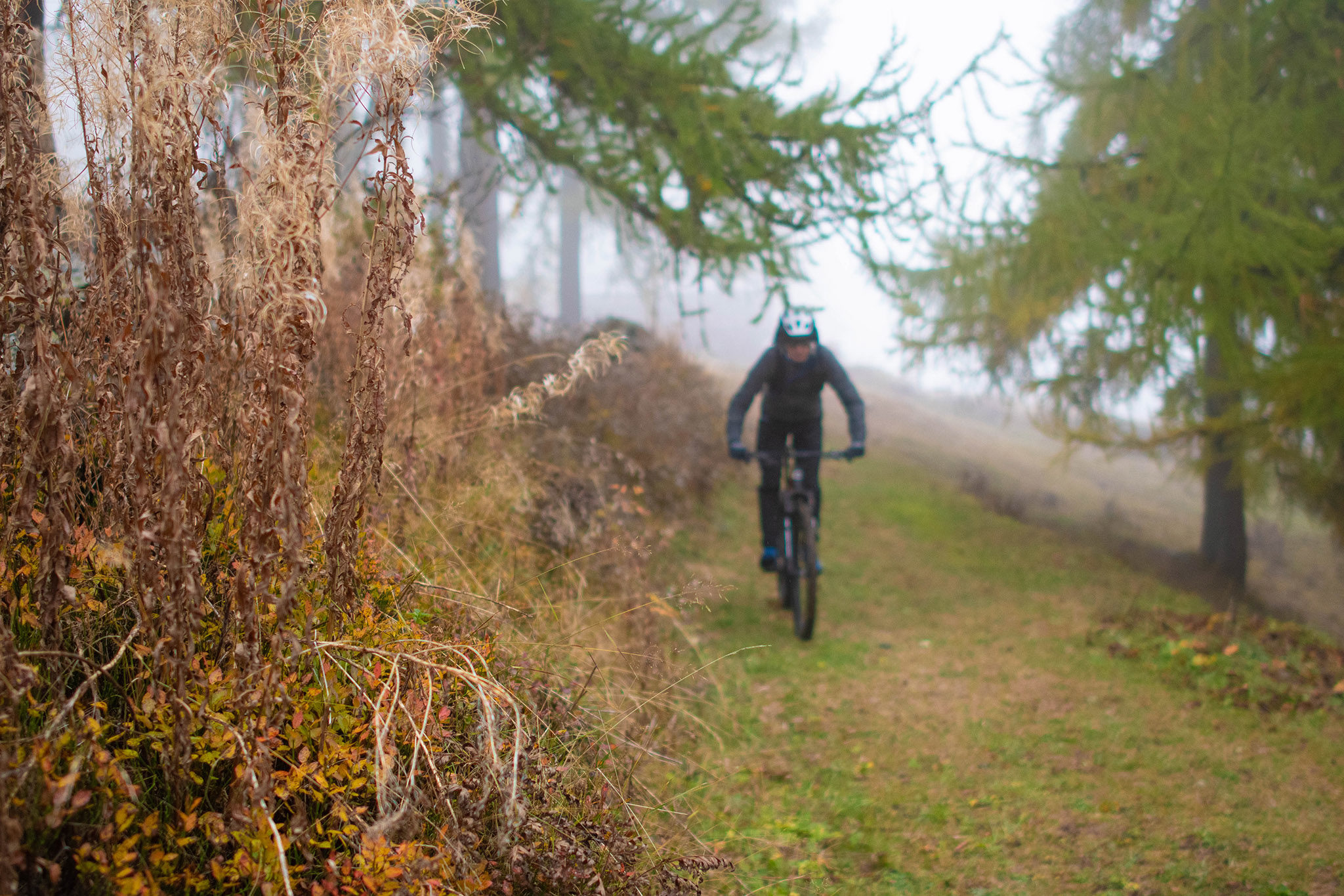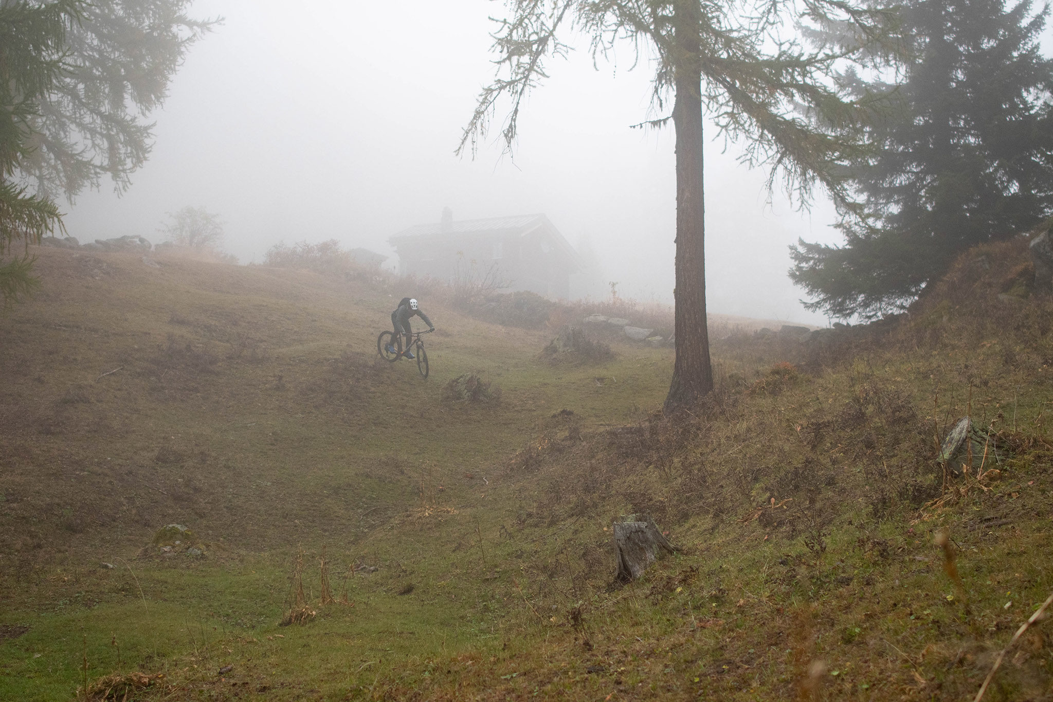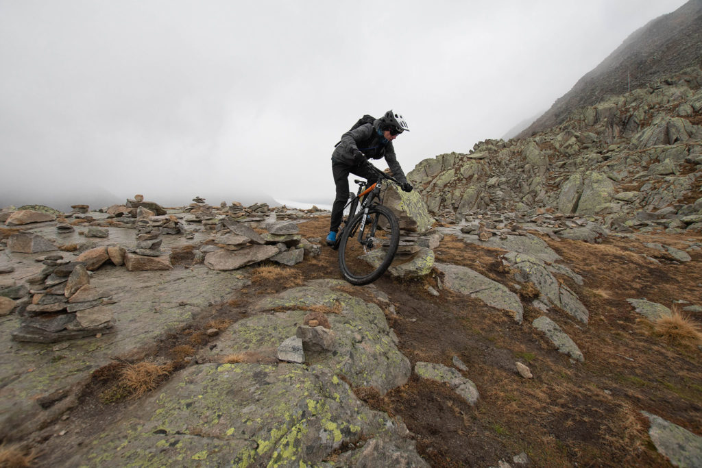 La dégringolade s’effectue sous une pluie mêlée à de la neige et la lumière commence à manquer pour distinguer les zones de relief sur le singletrack : la montagne se referme sur nous et l’appréhension nous submerge. Le sentier demande dextérité : Vincent ne s’en laisse pas compter et file dans la pente.