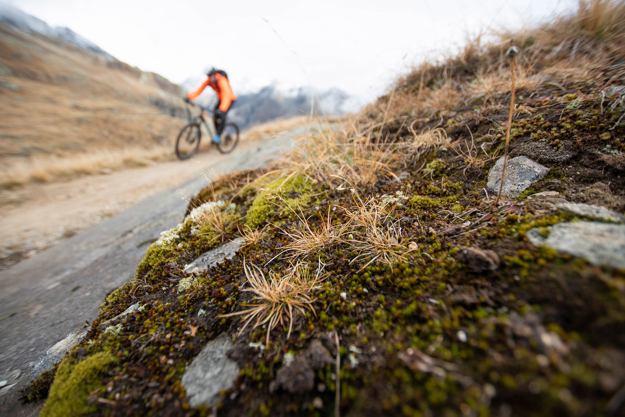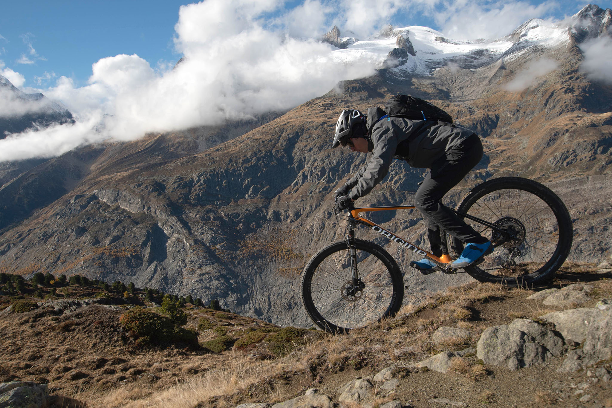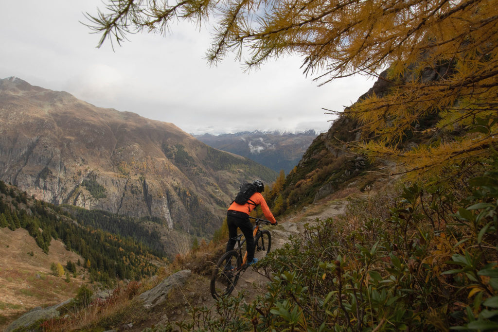 La lumière dure du soleil de l’été s’est adoucie depuis quelques semaines dans le Haut-Valais et elle illumine les versants de la montagne de tonalités chaudes et diffuses. En altitude, les vaches et les brebis sont redescendues suite au premier coup de froid. Dans la région de l’Aletsch Arena, doucement la fin de saison approche. Cette période est l’occasion d’aller capter les ambiances d’automne et de rouler dans un environnement grandiose.