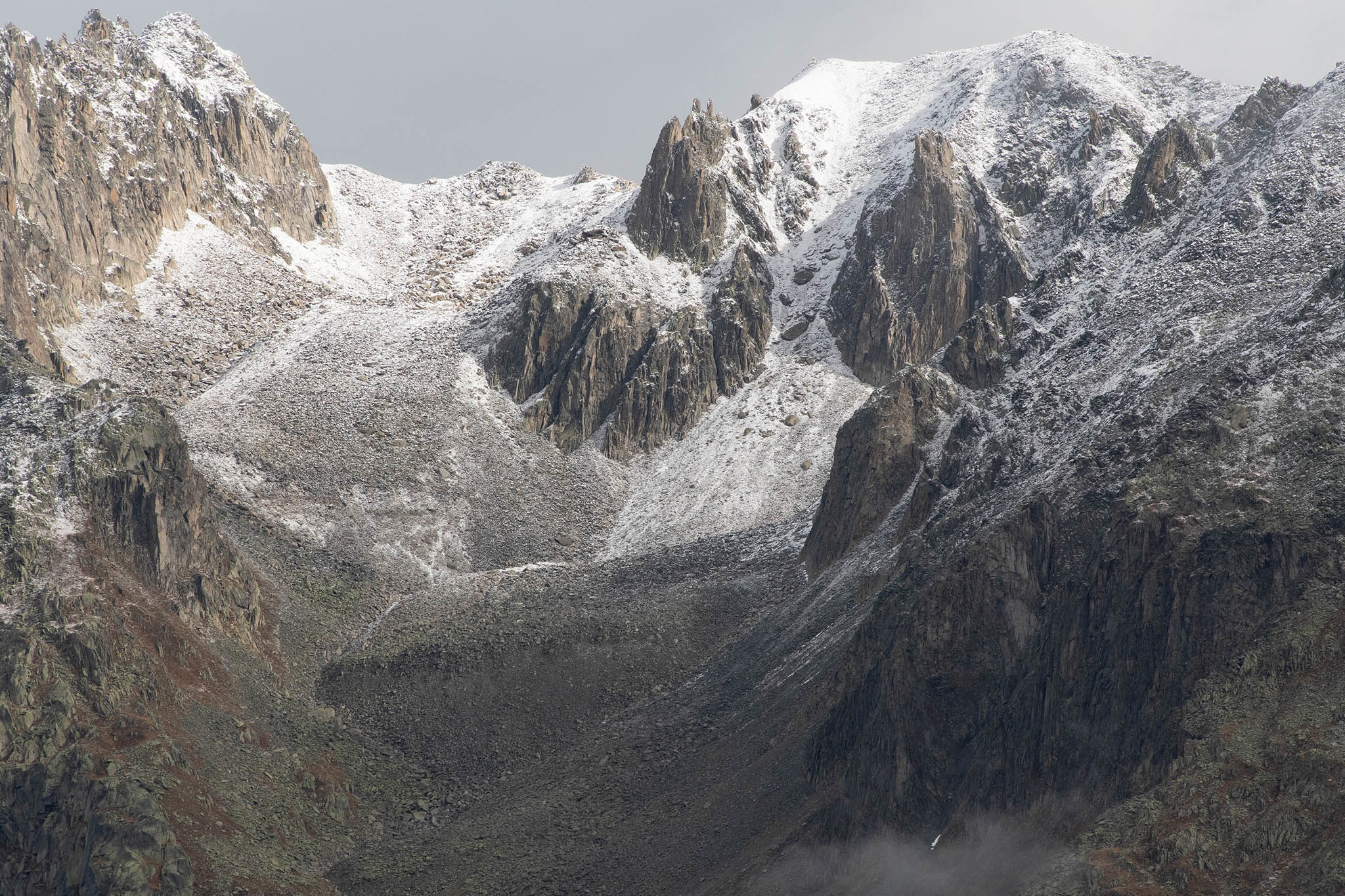 Là-haut, la montagne devient hostile. Sous la pluie battante, la vie a disparu. Pas de cri ou l’envol d’un choucas, rien que le minéral, brut, gris et froid au toucher. Il nous faut descendre.