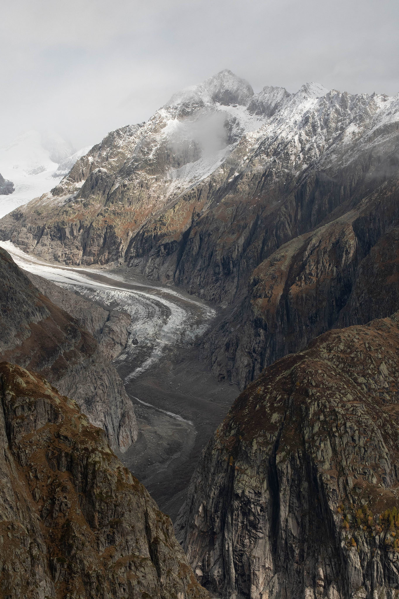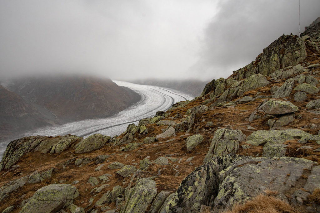 Malgré sa masse de 11 milliards de tonnes, il ne cesse de réduire son volume. Il y a 18.000 ans, la crête montagneuse reliant le Bettmerhorn et le Riederhorn était encore recouverte de glace et la langue du glacier touchait la vallée du Rhône. Mais ici comme ailleurs dans les Alpes, il a reculé et son temps est désormais compté à l’échelle chronologique de la terre.