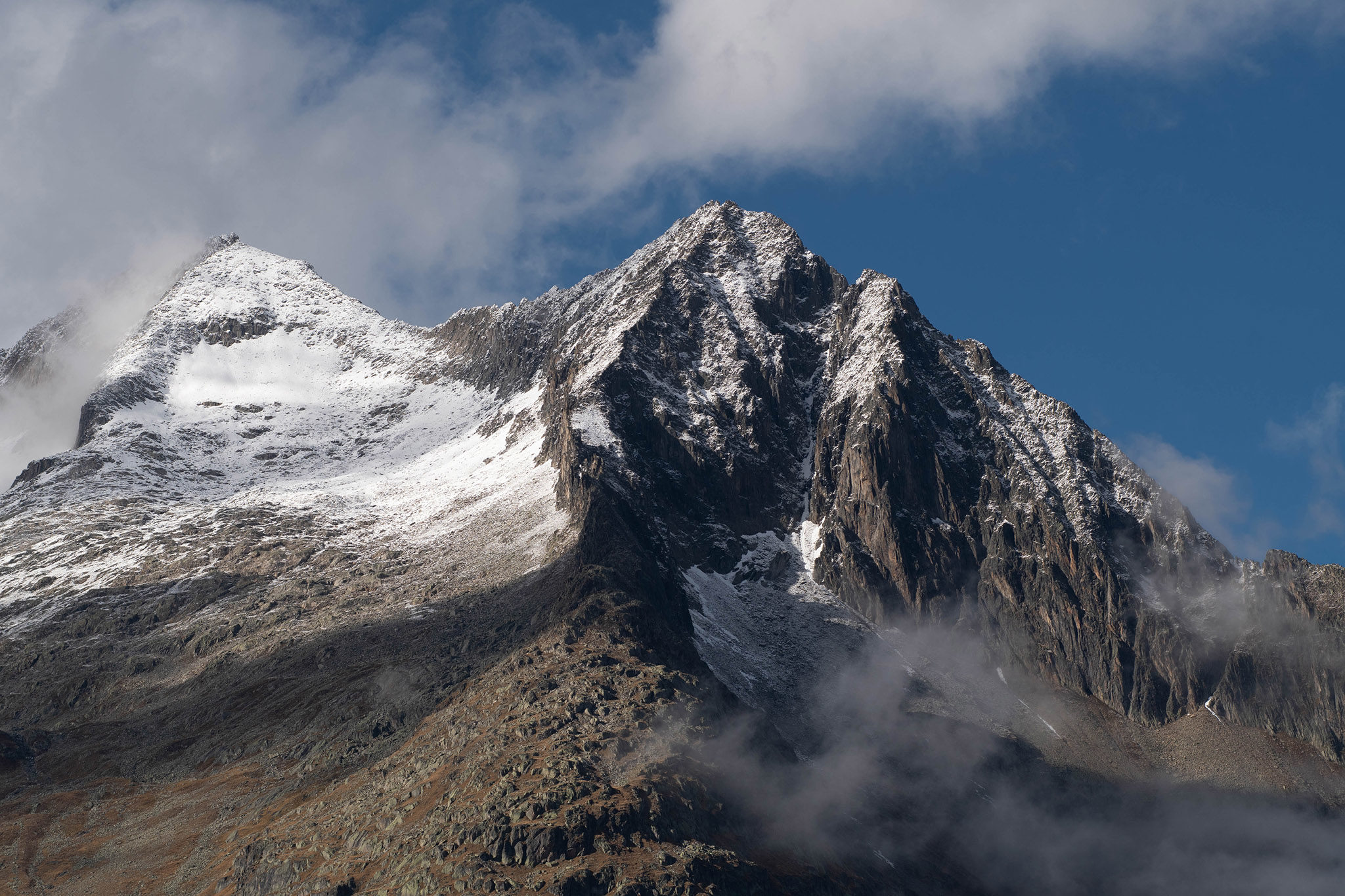 Le lendemain, le soleil illumine toute la chaîne des Big 4.000 mètres. La nuit plus froide a chassé la dépression.