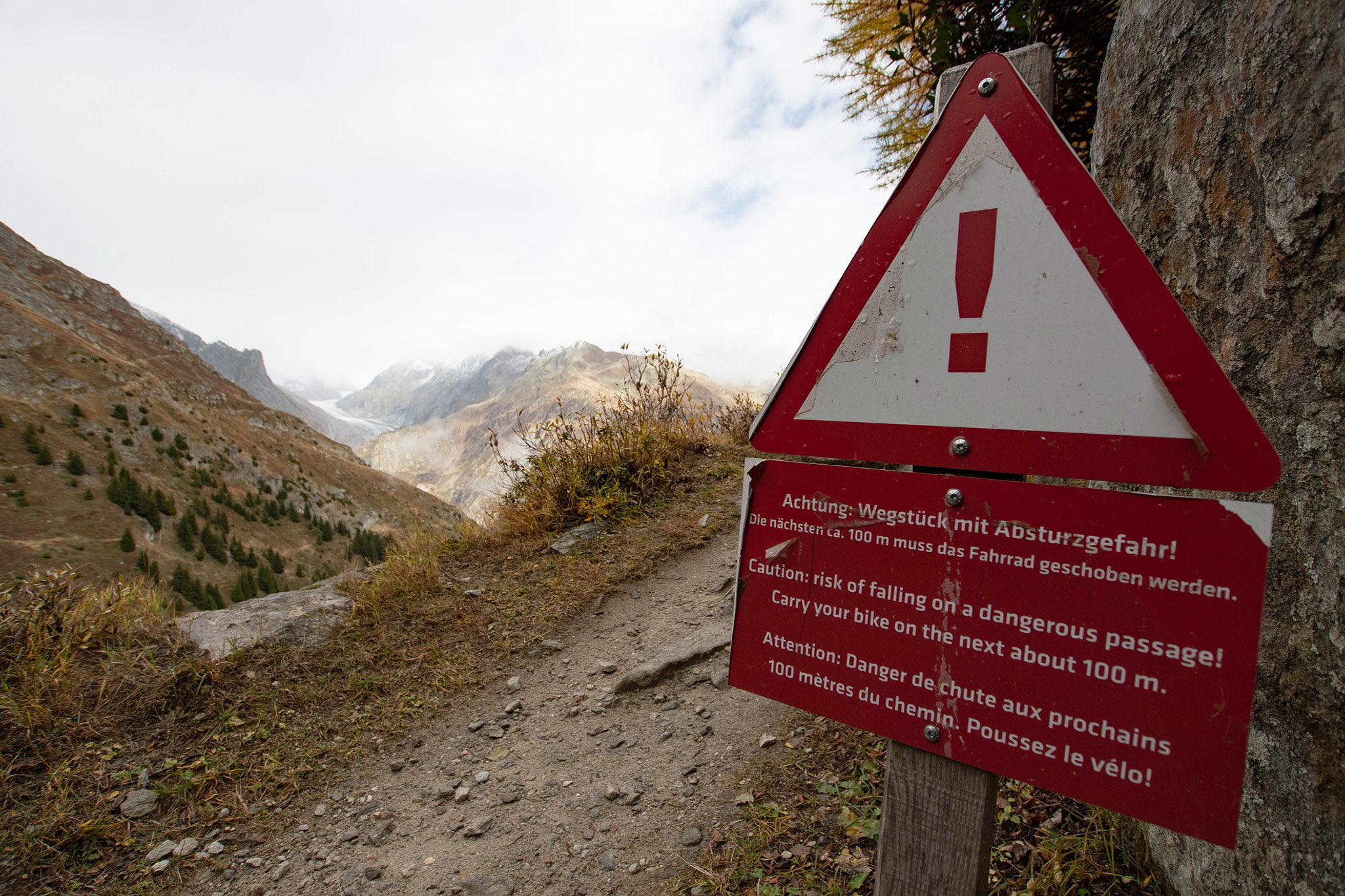Face au glacier de l’Aletsch, nous ne sommes plus des vététistes mais des spectateurs d’une nature grandiose. Avec ses 86 kilomètres carrés, il s’agit du plus grand des Alpes. Le fleuve de glace, long de 20 km, relie les montagnes du Valais à l’Oberland. Epais de 800 mètres à son point le plus dense, il pourrait se comparer à une mini calotte glaciaire comme celle de l’Antarctique. Ce géant inscrit sur la liste du Patrimoine mondial de l’Unesco est cependant en sursis comme tous ses congénères des Alpes.