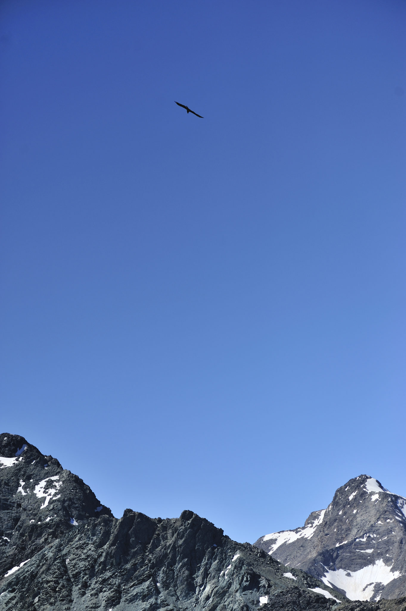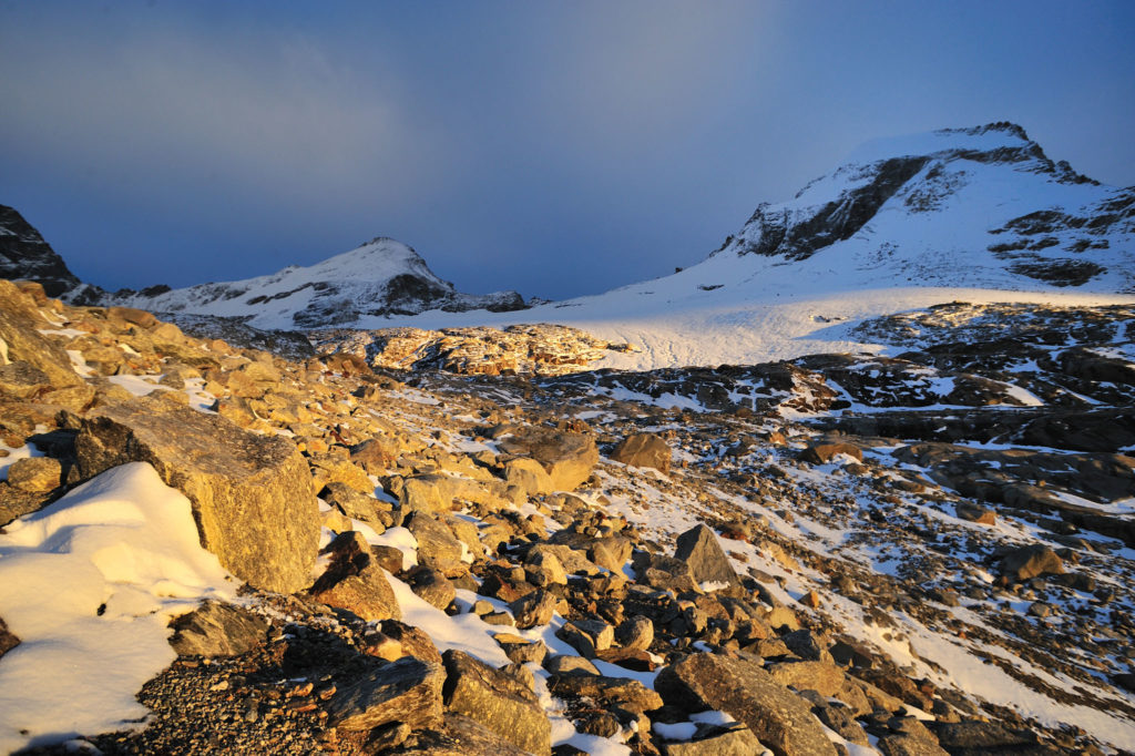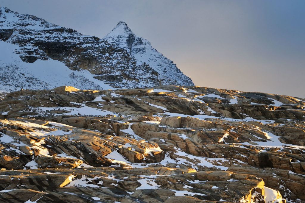 Au loin, nous voyons déjà le refuge Benevolo. Il est agréable de voir notre propre cheminement quand nous apercevons le chemin s’éclaircir sous la lumière rasante du soleil.