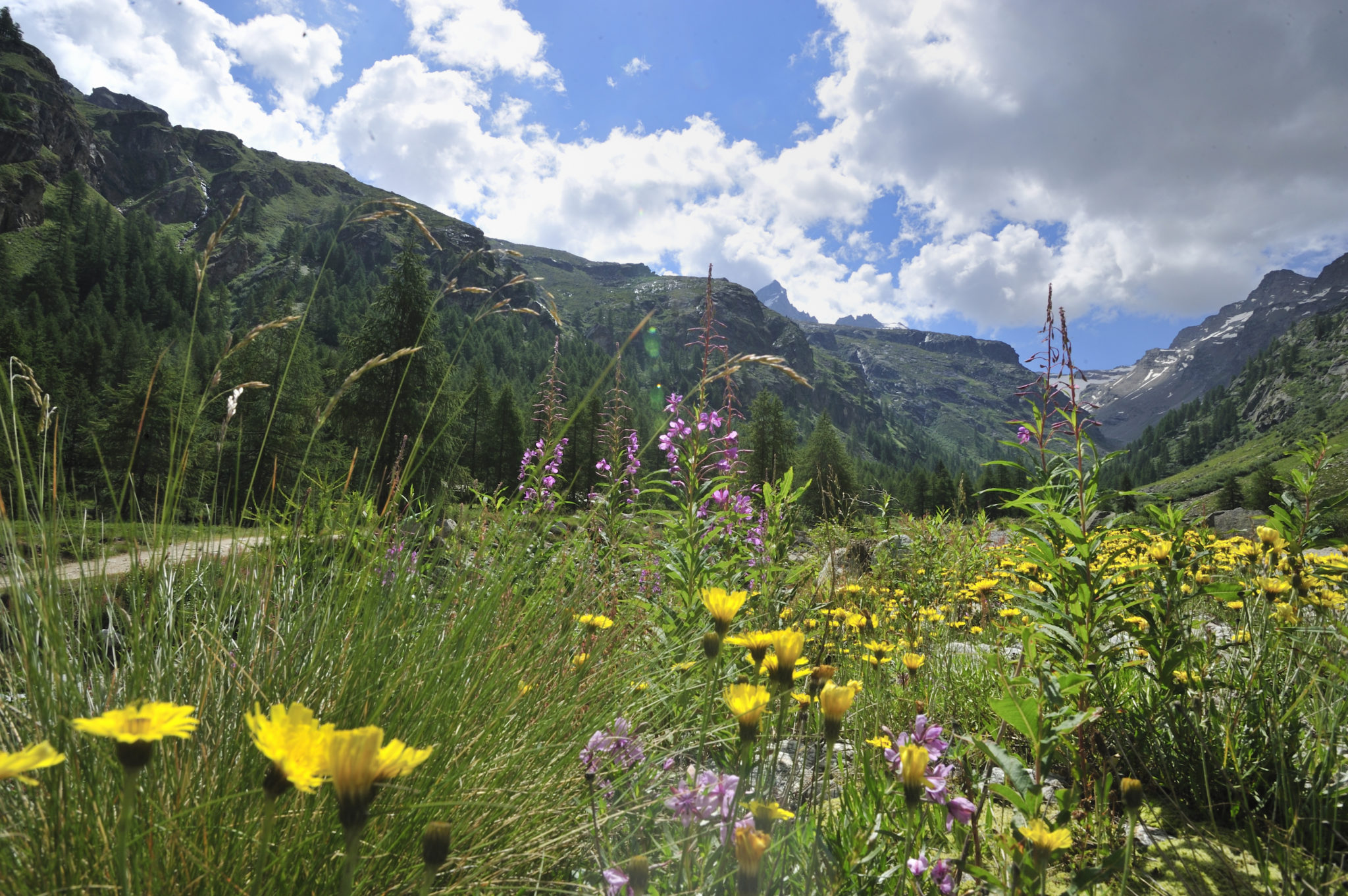 Nous sinuons dans la forêt. Au loin se détache le seul « 4000 », le Gran Paradiso (4061 m), entouré de la Tresenta (3600 m) et de la Bocca di Montandayné (3838 m). Un paysage qui se mérite et qui se vit, sans accès mécanique et artificiel.