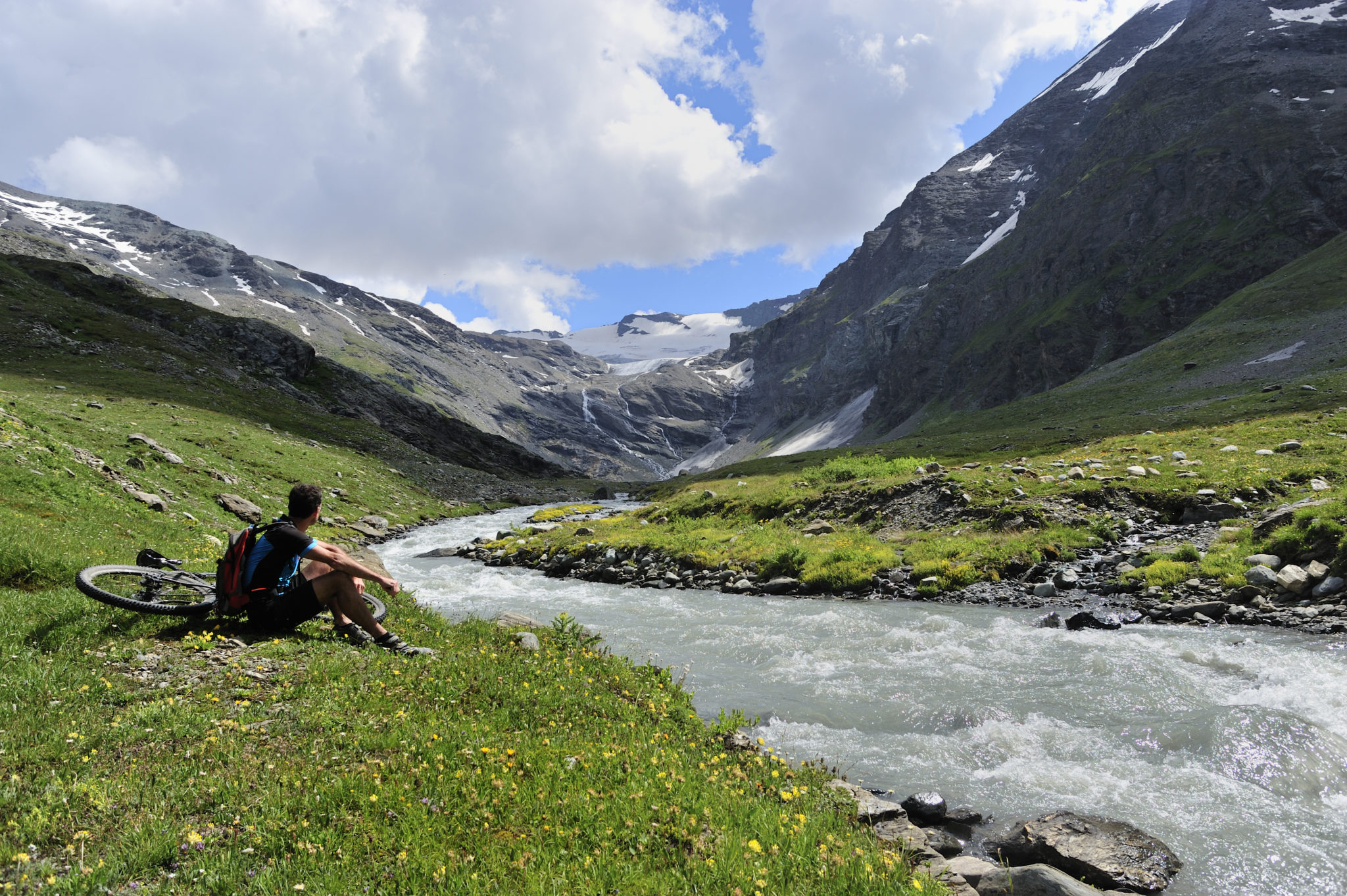 Nous quittons la route et remontons la vallée glaciaire. Nous avons l’impression de monter vers les hautes altitudes où règnent le froid et la glace. Le chemin, agréable à grimper en gravel, longe le torrent Di Valgrisenche. Plus on avance, plus le verrou de la vallée se ferme. Désormais il faut suivre un sentier technique mais pas insurmontable pour franchir la passe.