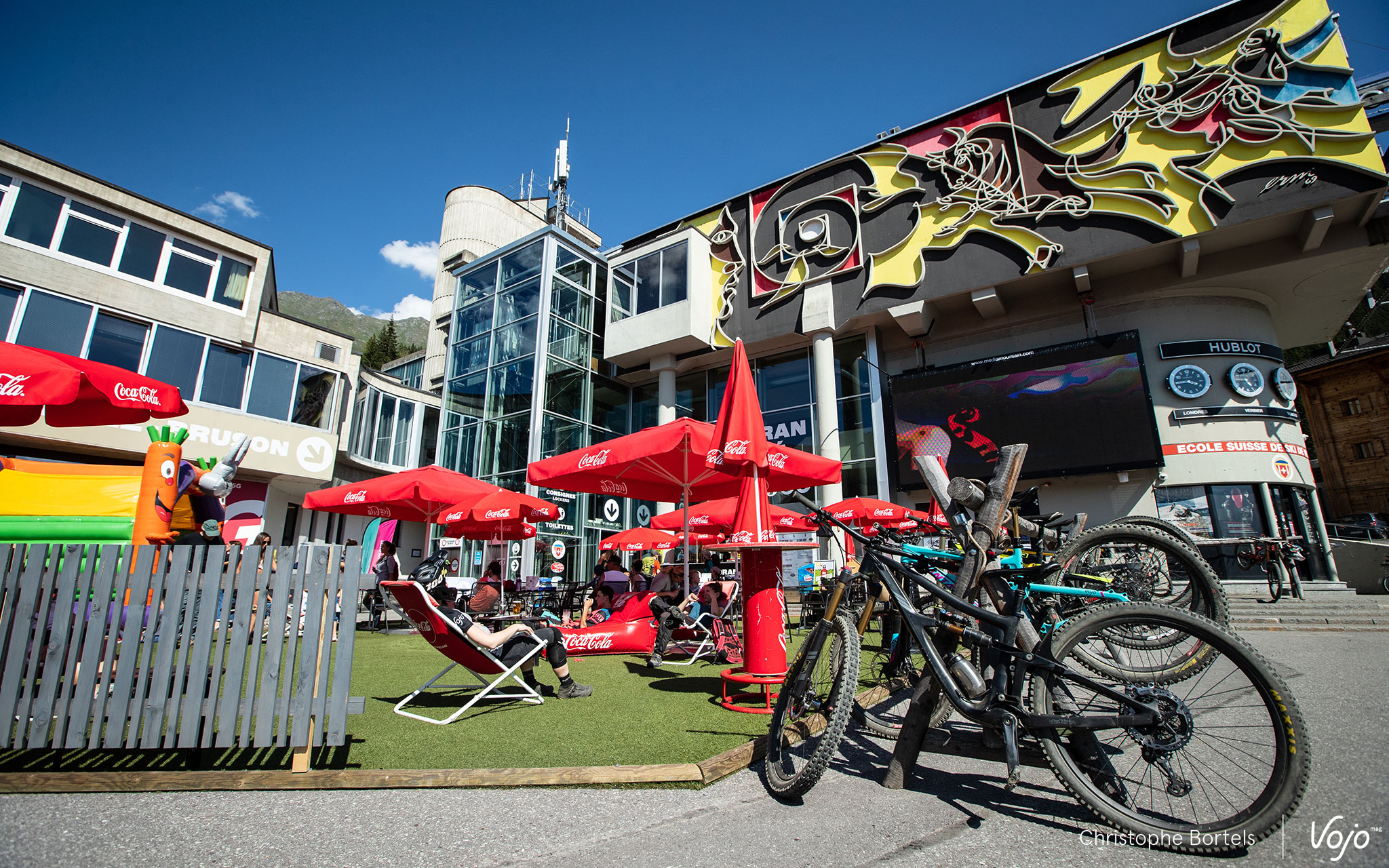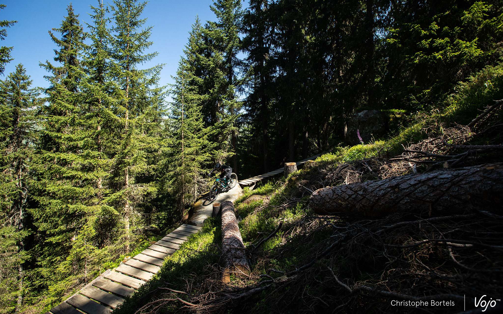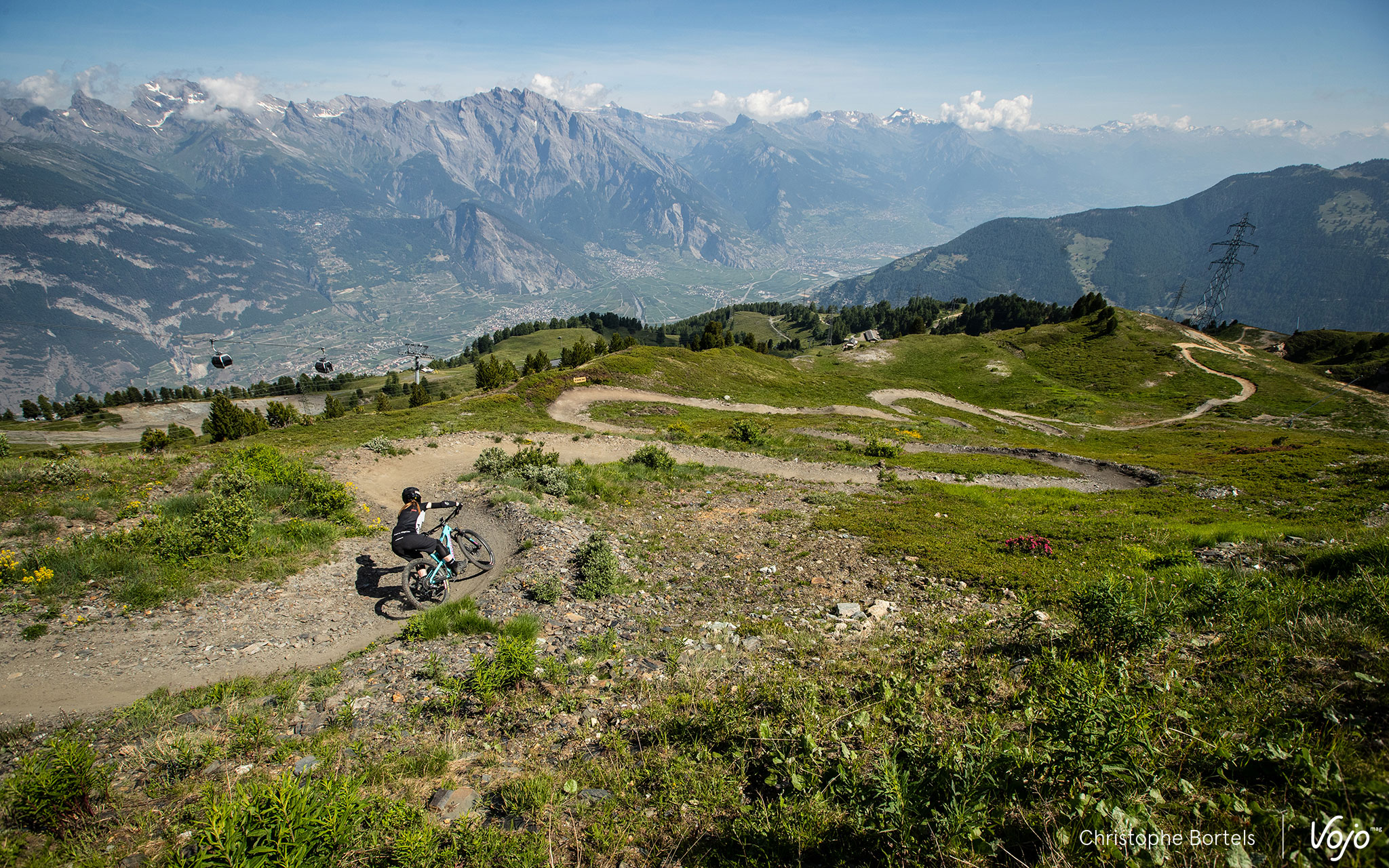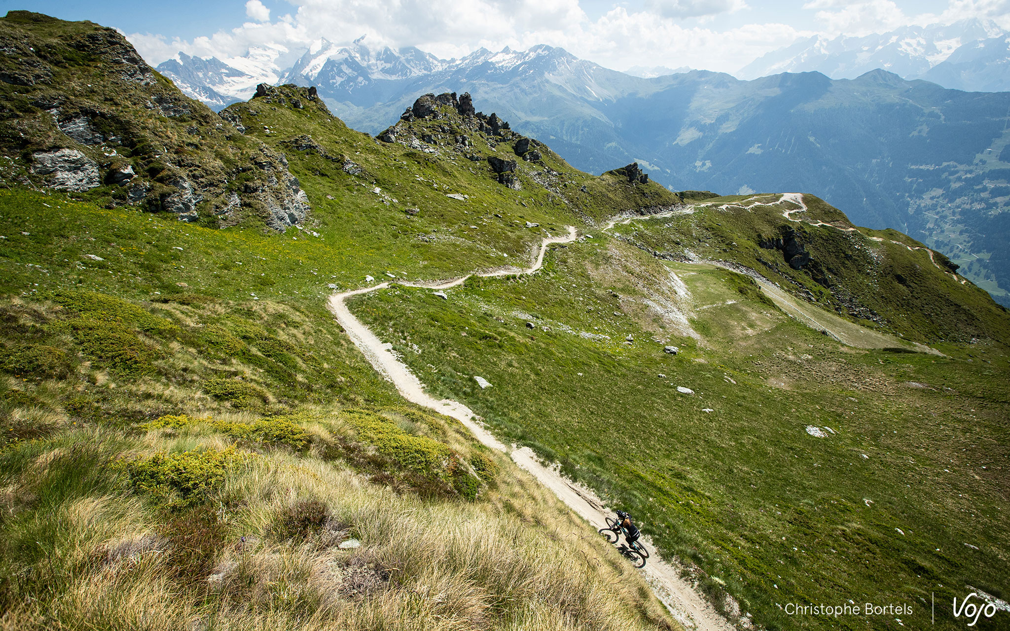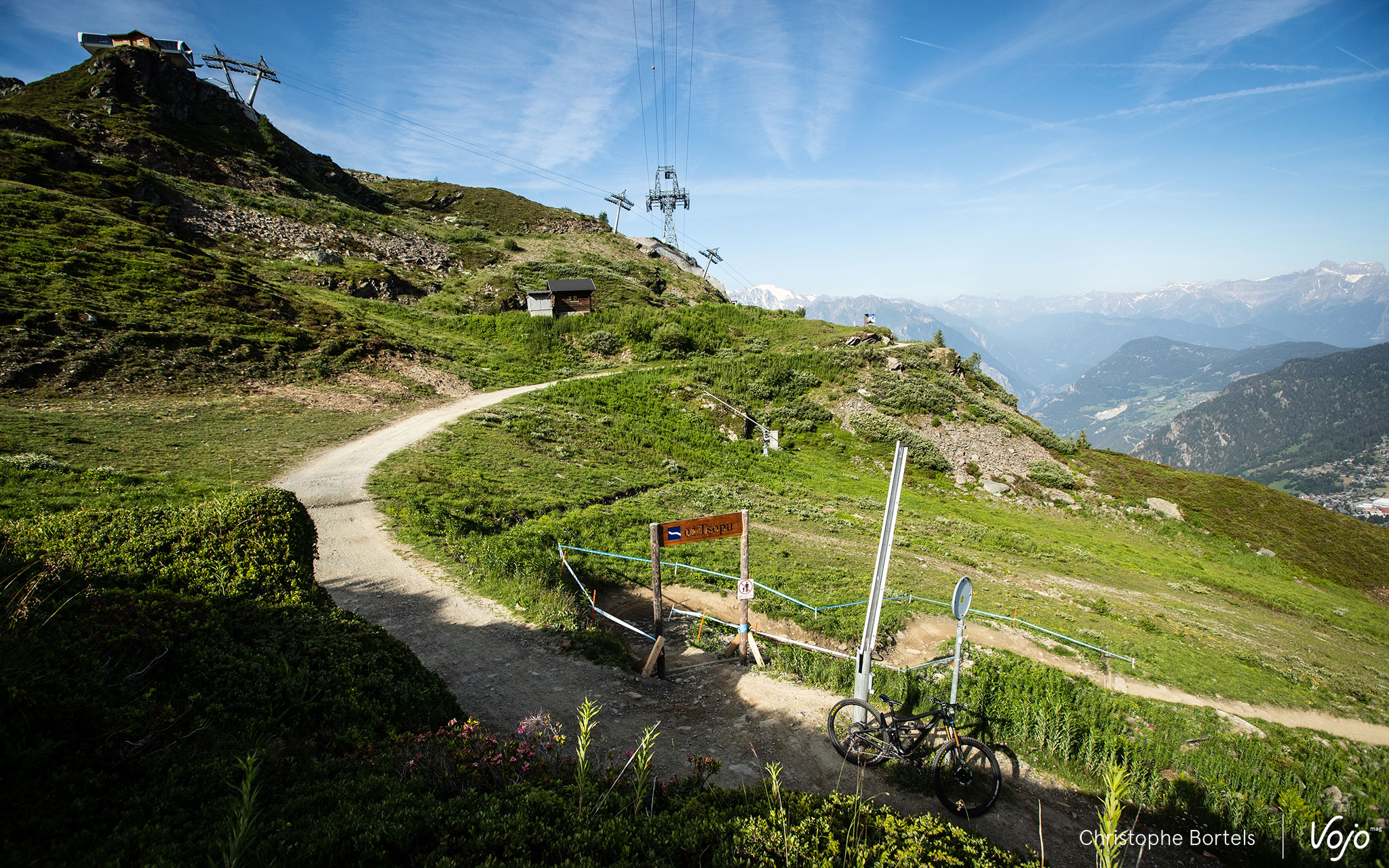 Après avoir emprunté la télécabine du Châble et celle des Ruinettes, le télésiège qui mène à Fontanet offre une vue imprenable sur les passerelles de la Bortabitche, une rouge de DH.