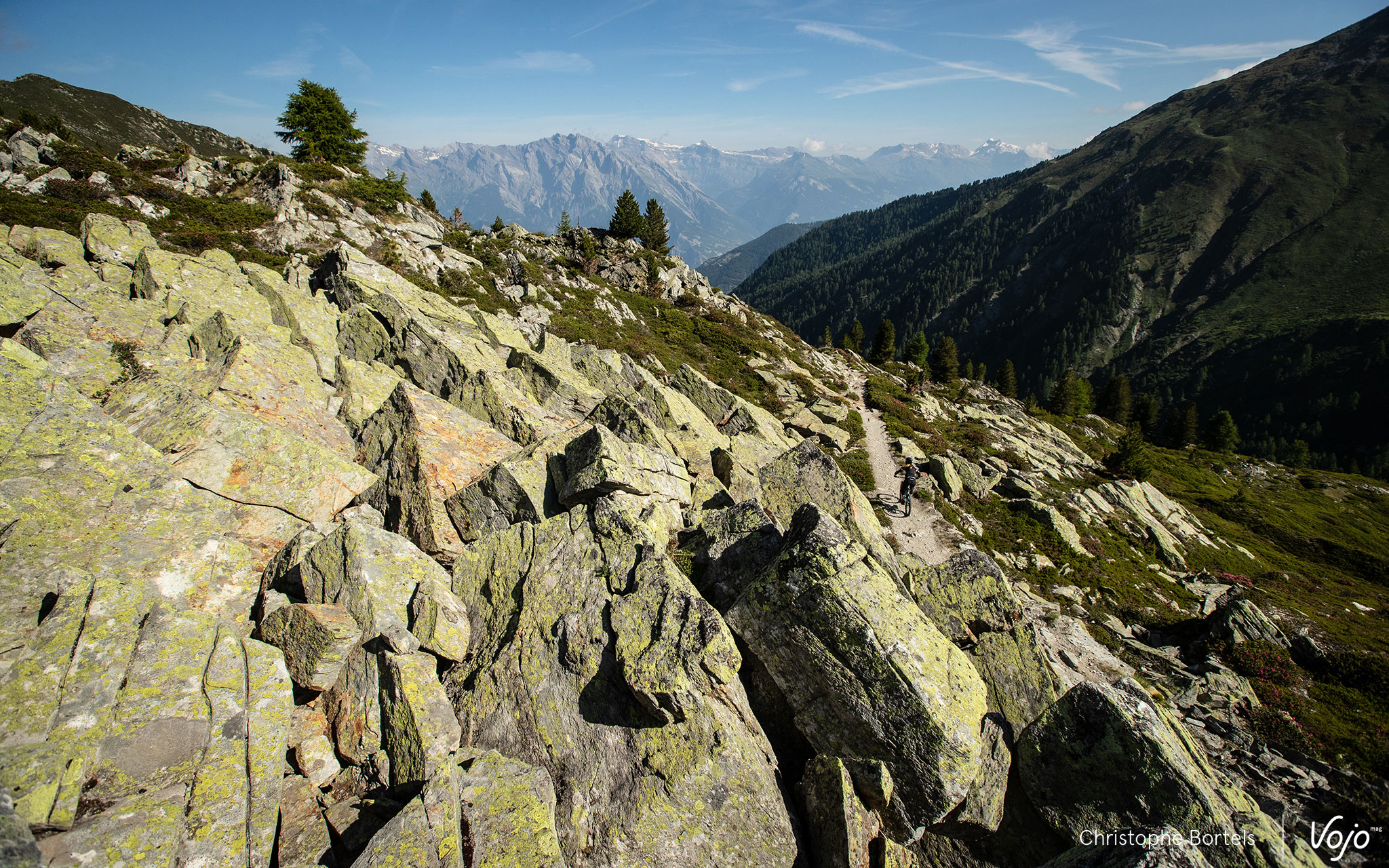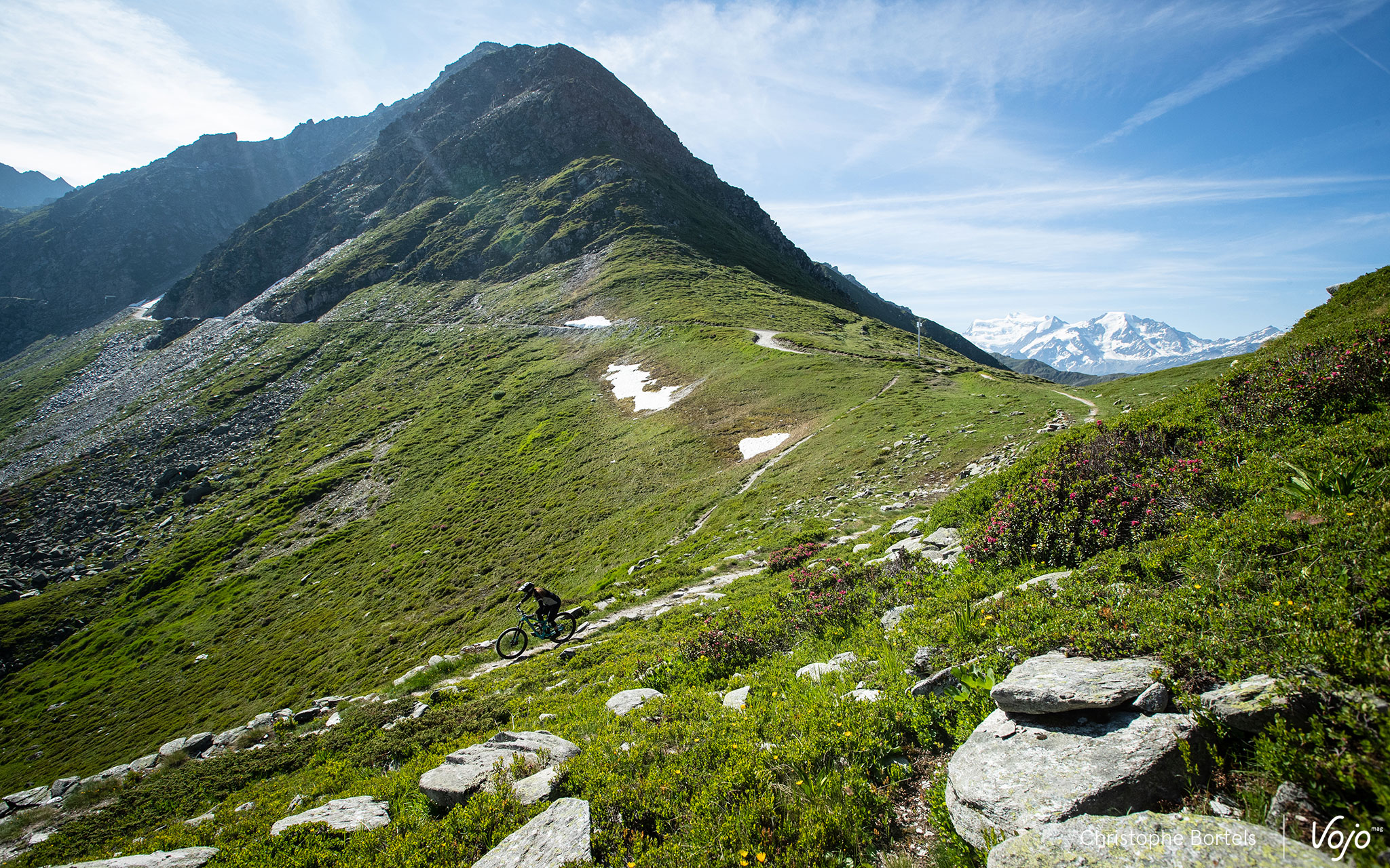 Au Col des Mines, on bascule vers le Vallon d’Arbi en empruntant une trace rouge d’enduro. Tout ça dans un paysage de carte postale qui ne nous quittera plus de la journée…