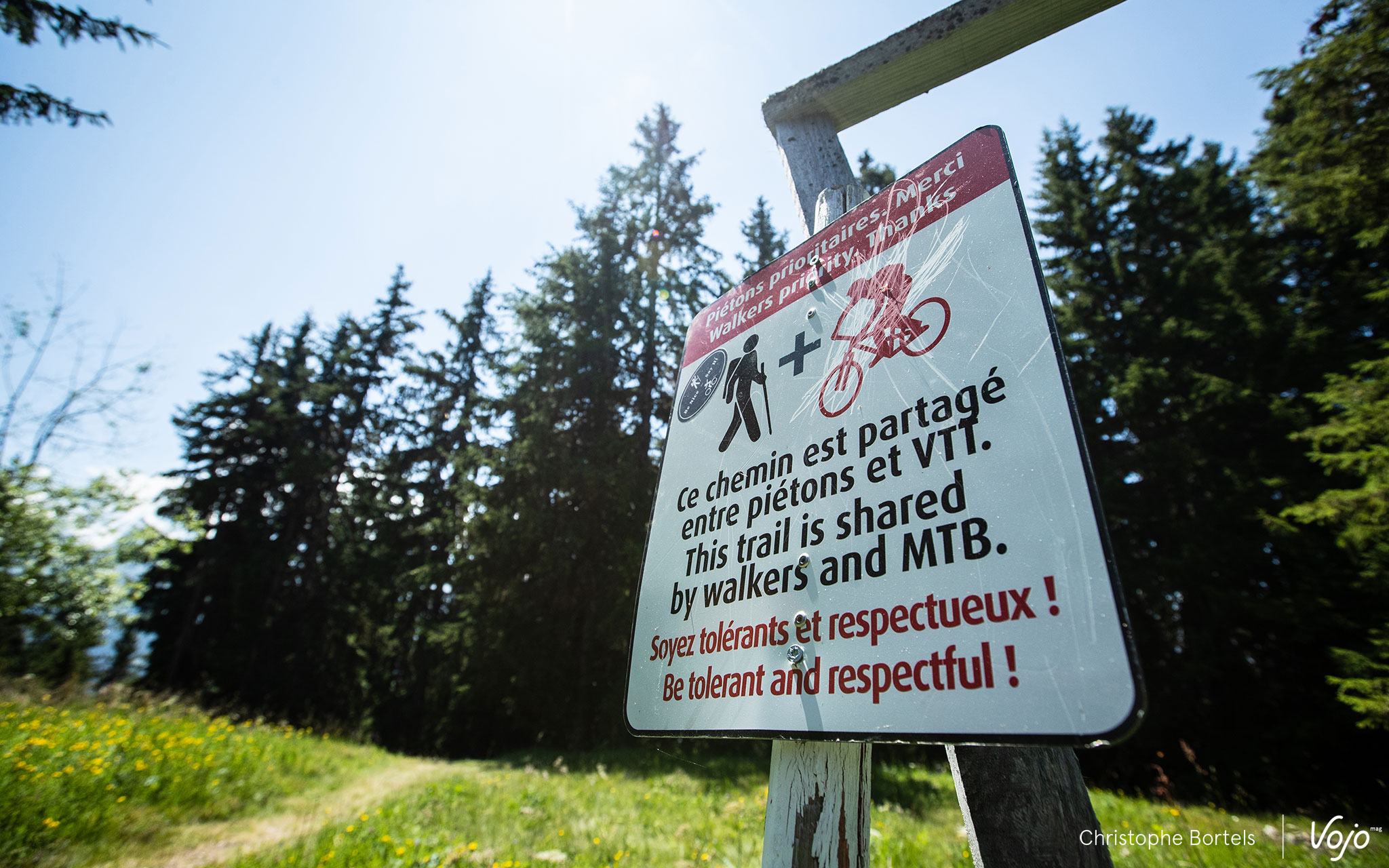 Un peu plus loin, on s’engage sans grande conviction dans un chemin où l’on découvre ce panneau : visiblement les sentiers partagés ne sont pas au goût de tout le monde, mais au moins on a la confirmation qu’on est toujours sur un sentier VTT !