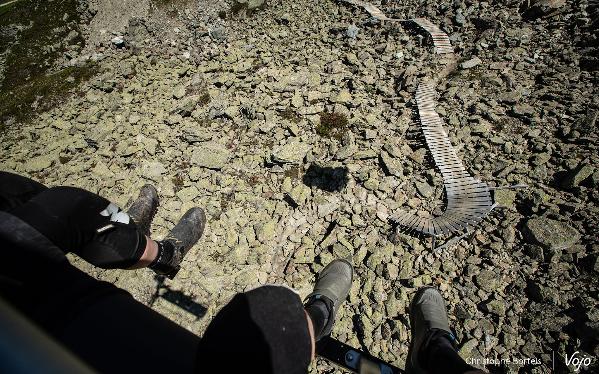 Vient enfin cet impressionnant passage en passerelles aménagées au-dessus d’un tout aussi impressionnant pierrier… Bluffant et inoubliable !