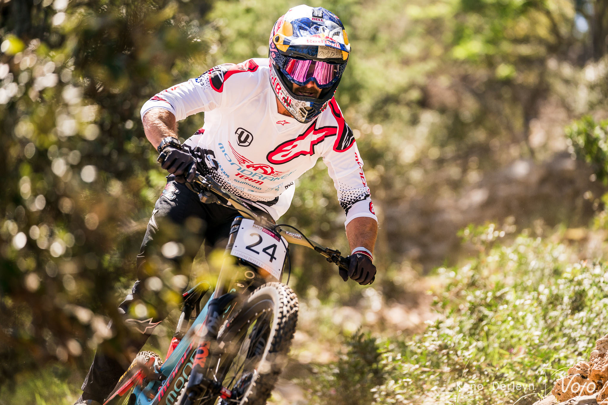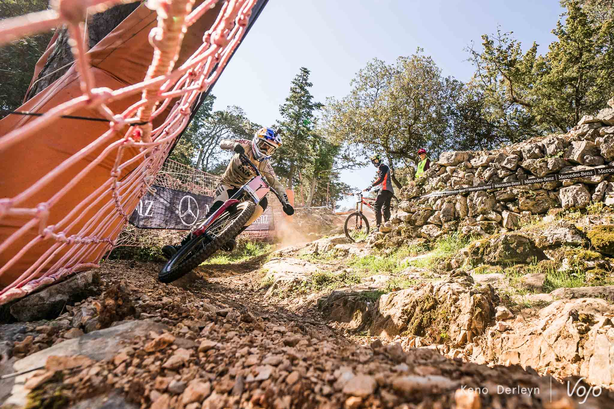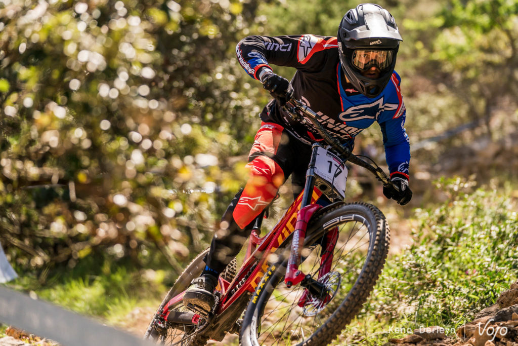 Quand on lui a demandé qui l’a déjà impressionné, Loris Vergier a fait partie de ses réponses. Par chance, nous l’avons croisé en fin de journée et voici ce qu’il nous a déclaré : « Je pense qu’on était tous excités ce matin. On avait tous de la testostérone à bloc pour montrer ce qu’on sait faire, du coup on est beaucoup à s’être lancés à bloc, et plusieurs d’entre nous se sont fait mal. Alors là pas le choix, il faut se calmer parce qu’entre les cailloux qui roulent, les drops un peu chauds, tout ça commençait à aller un peu vite ! Il faut un peu gérer au mental. Niveau matos ce n’est pas non plus évident car pour avoir du grip il faut que les pneus soient relativement mous mais il y a des sauts avec des réceptions bien à plat donc c’est un vrai bordel ! Je n’ai pas crevé mais ce n’est pas pour autant que je me sens épargné car même le plus petit rocher peut être fatal ! En fait, quand tu ne sais pas où tu mets les roues, il y a une chance sur deux pour que tu crèves ! ».