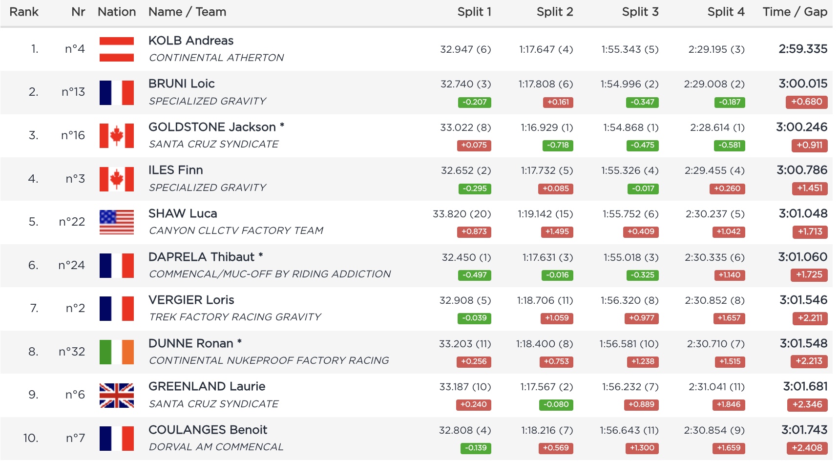 Loïc Bruni prend finalement la 2e place à 0,680s de la victoire, alors que Jackson Goldstone signe une performance impressionnante en terminant 3e à moins d’une seconde. Il s’agit du premier podium chez les Elites pour le jeune Canadien qui courait encore en junior la saison dernière.