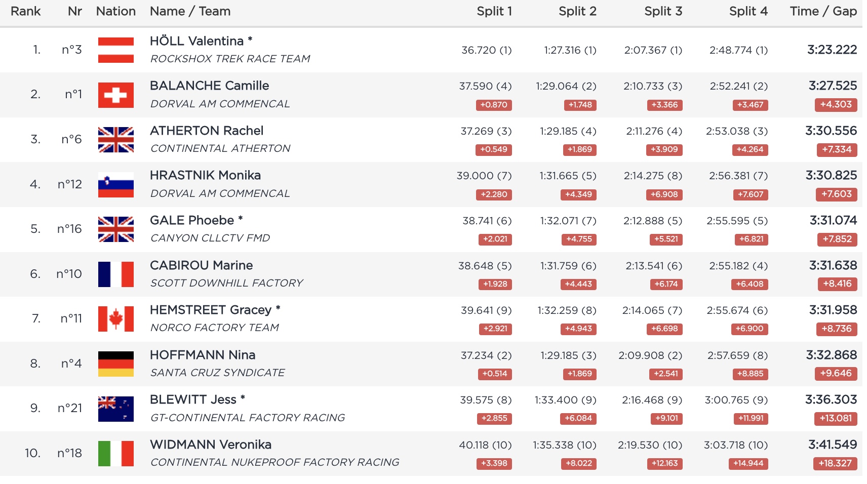 En finale, Nina Hoffmann, avant-dernière à s’élancer, met fin à une partie du suspense en chutant dans la dernière section pentue et technique de la piste. La voie est alors ouverte pour Vali Höll. On a connu l’Autrichienne fébrile dans ce genre de situation par le passé, mais ce n’est plus le cas désormais. Höll réalise un run ultra-efficace, pour ne pas dire agressif, et parvient à battre de plus de 4 secondes le temps de référence réalisé un peu plus tôt par Camille Balanche ! Elle aura donc signé le week-end parfait en remportant les trois manches chronométrées du week-end…