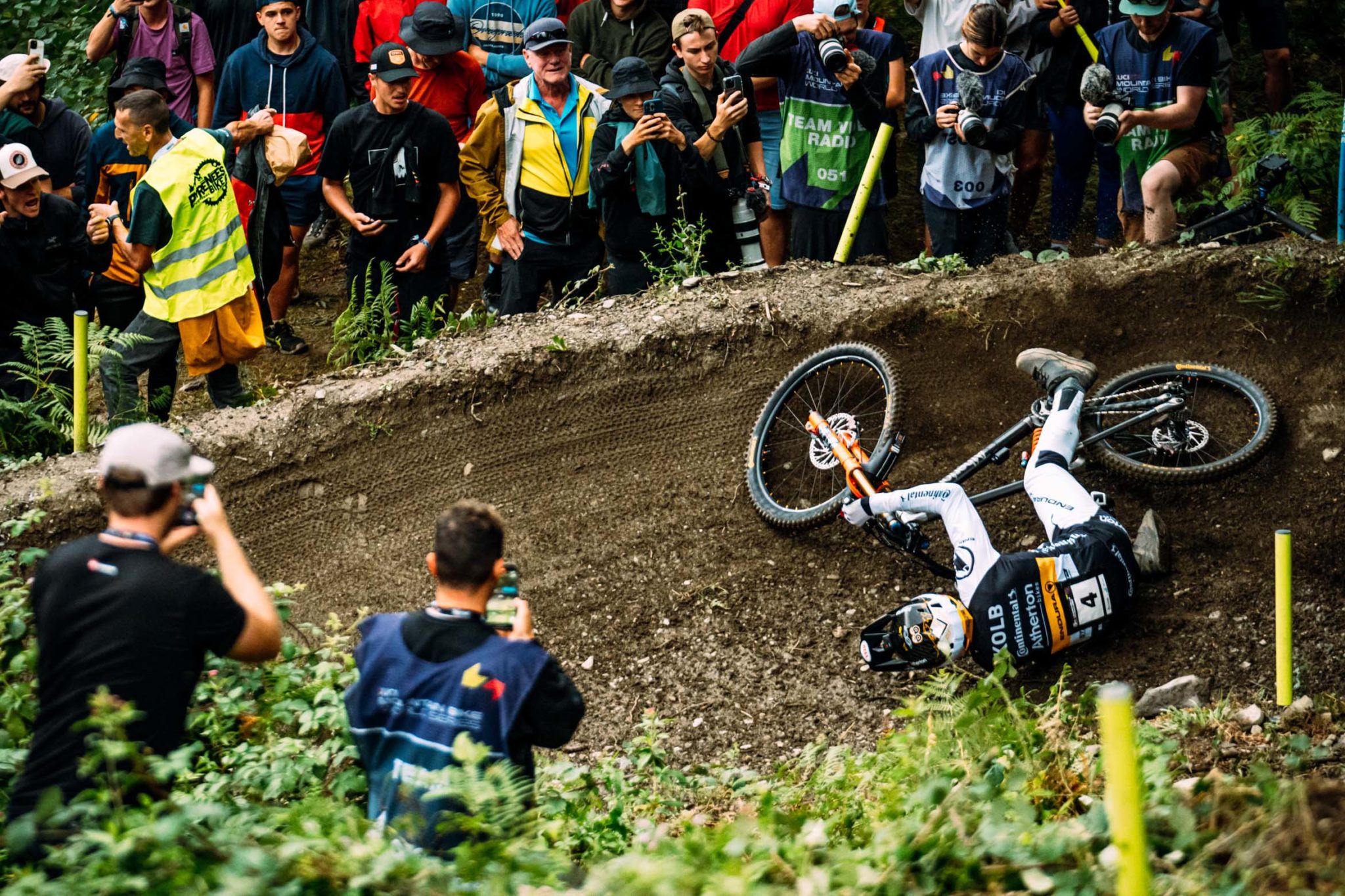 Juste après, c’est Thibaut Dapréla qui s’élance pour tenter de battre ce nouveau temps de référence (3:31:785) tout juste signé par le pilote du team Specialized Gravity. Victorieux lors de la manche de Vallnord, le pilote Commencal revient à 51 centièmes de secondes lors du 3e point de passage…avant de chuter lourdement. Le pilote français perd la main droite du cintre sur une des phases de freinage du circuit et passe au-dessus du vélo. Plus de peur que de mal, le Français se relève directement à la recherche de son vélo, qui a été projeté plusieurs mètres derrière le filet de sécurité, c’est fini pour lui.