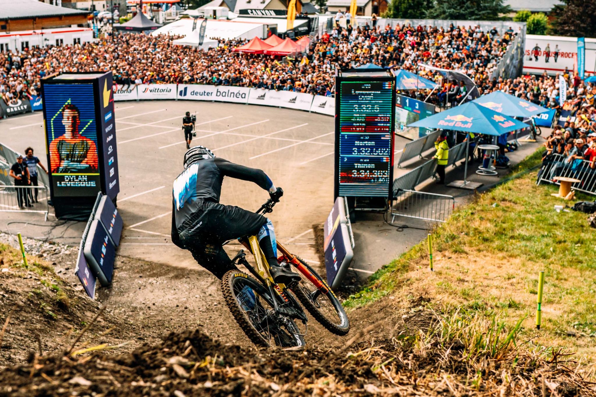 Finn Iles, leader au général de la coupe du monde, s’élance sous un soleil désormais étincelant. Le pilote canadien affiche déjà près d’une seconde de retard au premier point de passage, mais le pire est à venir : le pilote perd la pédale sur l’un des sauts du circuit, sort de la trajectoire et passe derrière les poteaux marquant la délimitation de la piste. Ce franchissement entraîne sa disqualification, lourd de conséquences pour la première place au classement général…