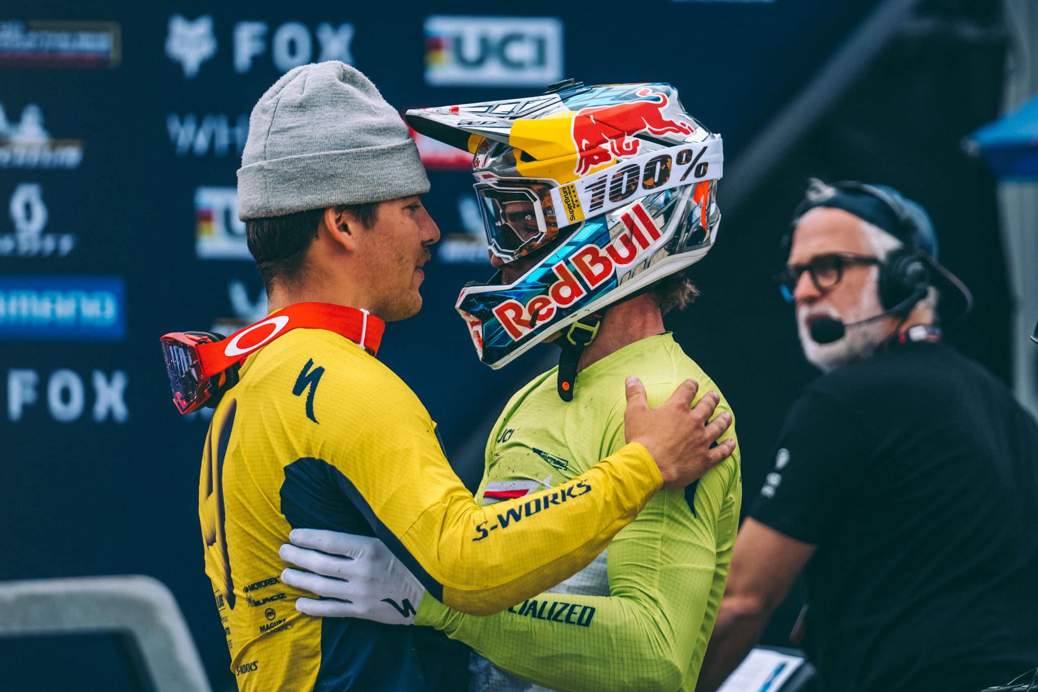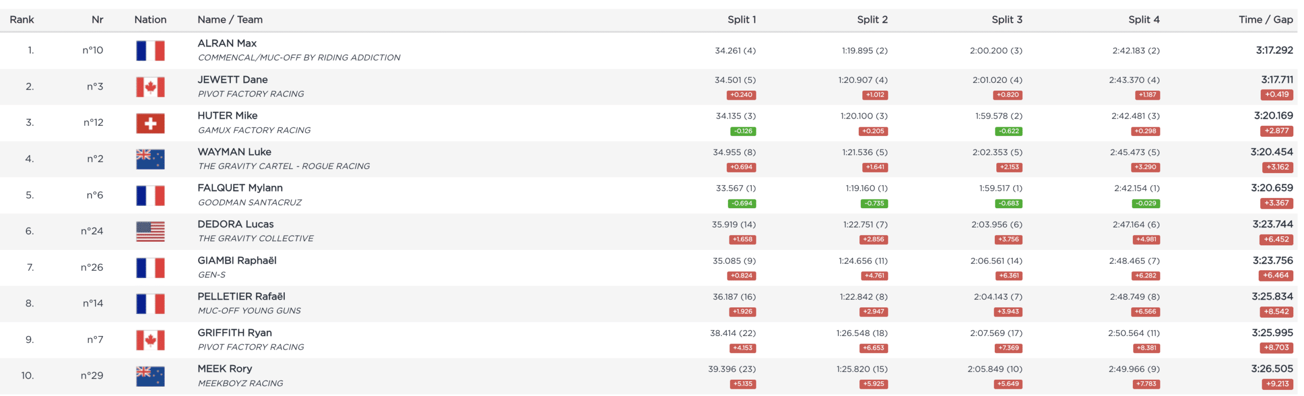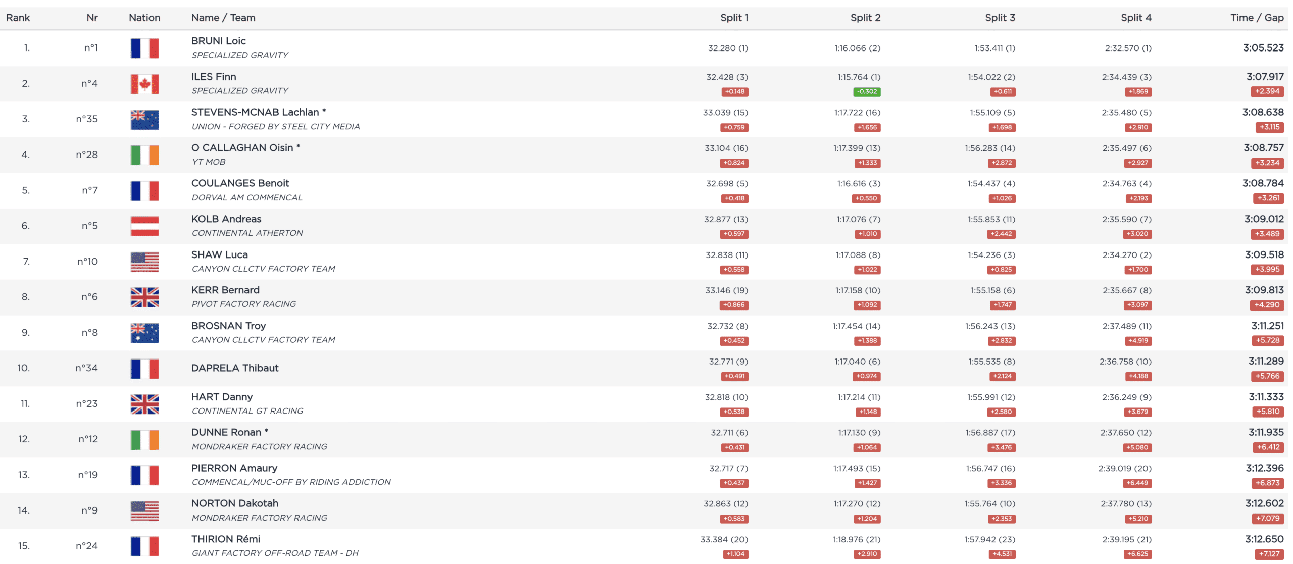Meilleur temps de la demi-finale hier, Loïc Bruni est le dernier à s’élancer. Le Français a décidé de jouer avec nos émotions, allumant le vert au premier intermédiaire, puis de pas grand-chose le rouge au deuxième… Il reprend l’avantage sur son coéquipier avant le bois, et à partir de là, la machine est lancée. Pratiquement deux secondes d’avance au dernier intermédiaire, et finalement…