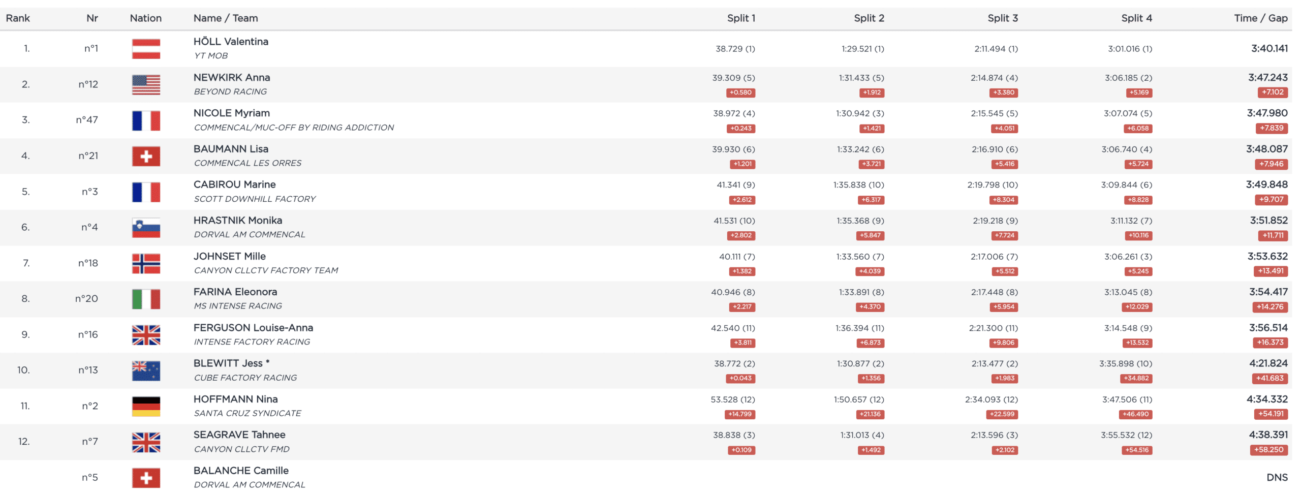 Il ne reste alors plus qu’une pilote au départ, et pas n’importe qui : la locale, la championne du monde en titre, la vainqueure sortante… Vali Höll ! L’Autrichienne va rapidement tuer tout suspense, améliorant son avance de split en split. Avant le bois final, elle est 3 secondes devant. La section technique est négociée proprement, et même prudemment, pourtant à la sortie l’avance est montée à 5 secondes. Elle sera finalement de plus de 7 secondes sur la ligne !